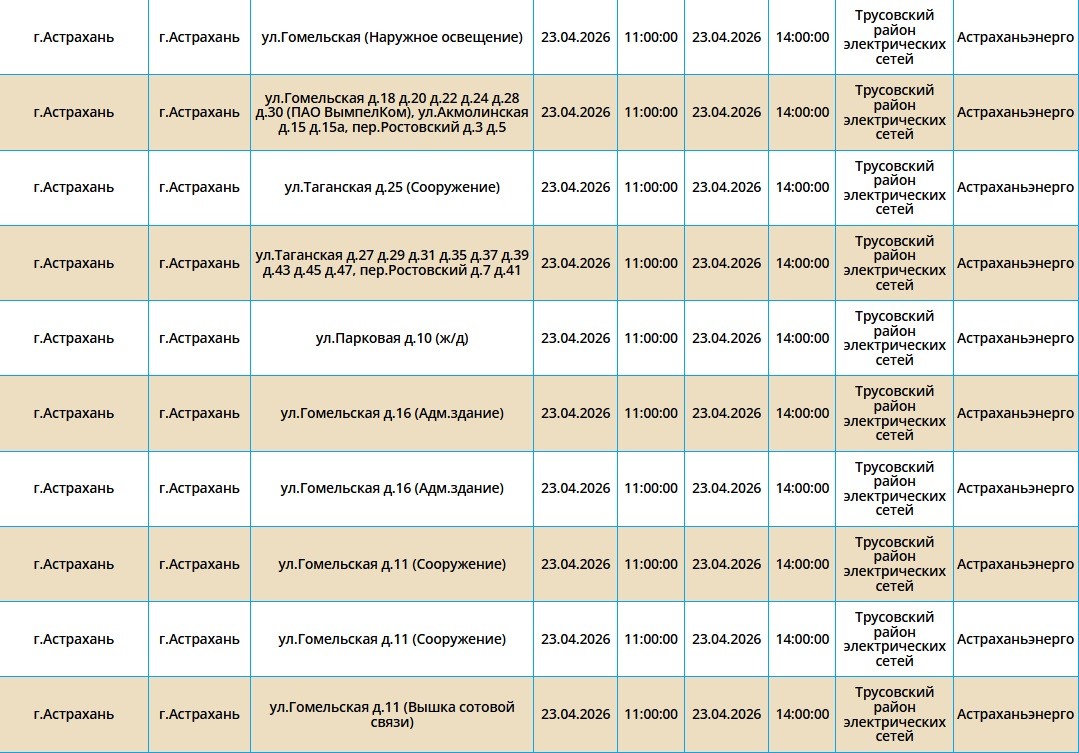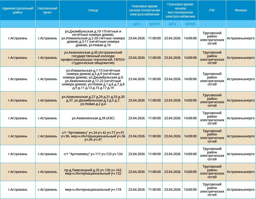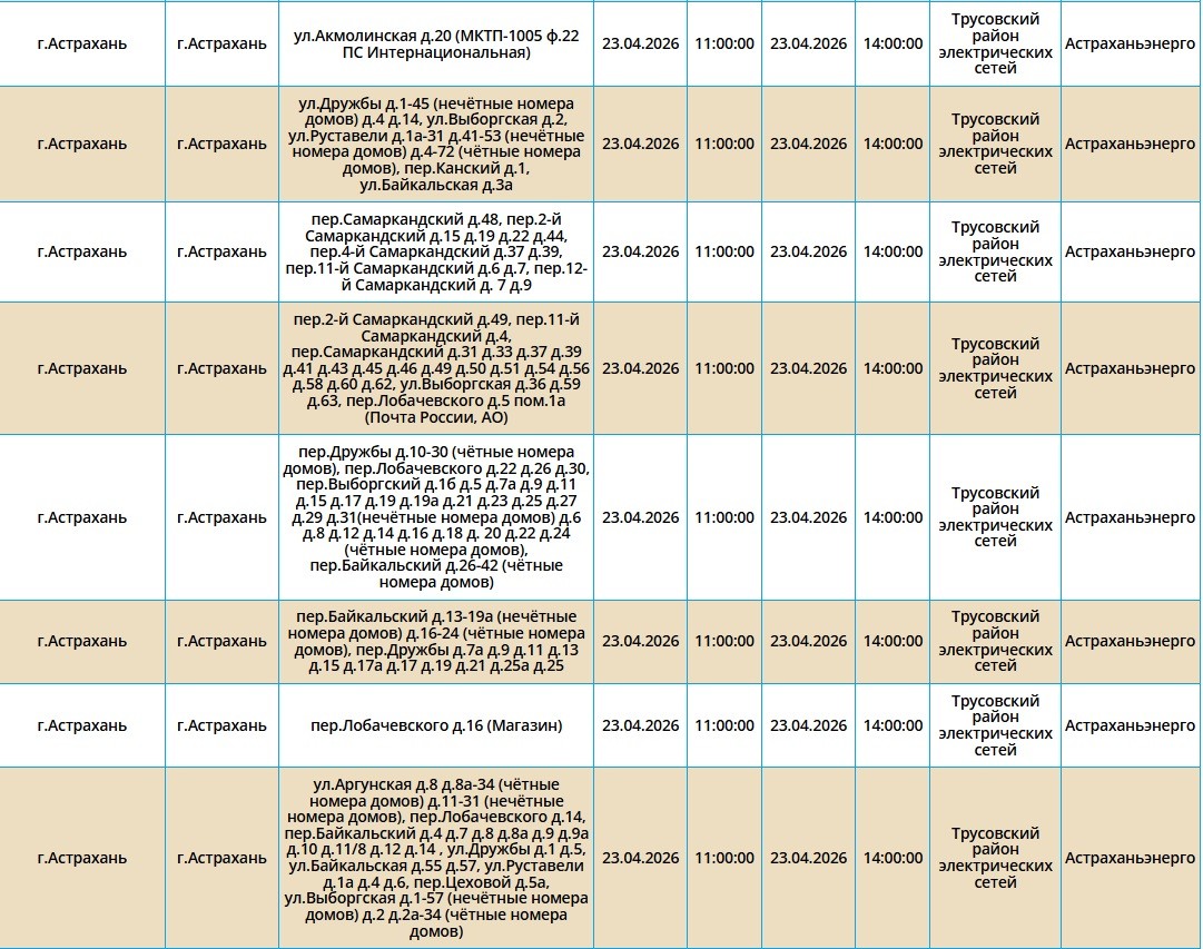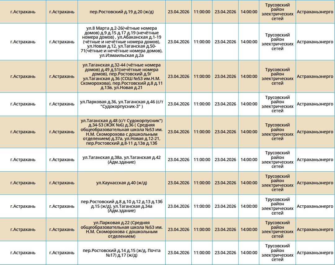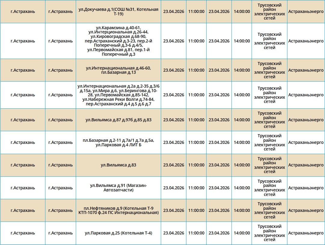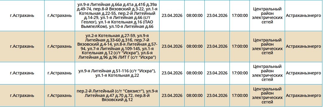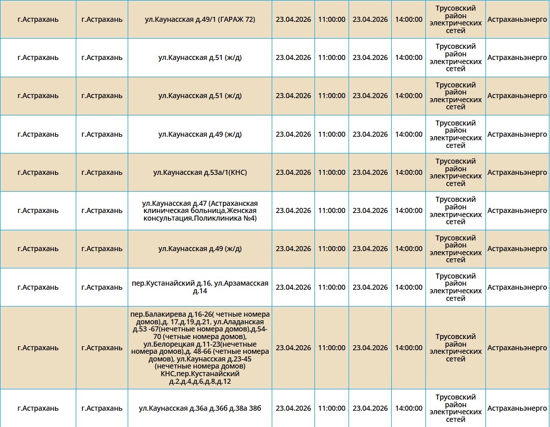 Второй день подряд в регионе пройдут массовые отключения света, из-за чего тысячи астраханцев на несколько часов останутся без бытового комфорта. Так, электроэнергии не будет как в самом городе Астрахань, так и в Приволжском и Икрянинском районах. Однако энергетики заверяют, такие отключения мера плановая и необходимая, чтобы обеспечить своевременный ремонт на электросетях. Поэтому не стоит переживать, а лучше подготовиться заранее - зарядить необходимые гаджеты и отключить приборы из сети, чтобы избежать неприятных последствий. Список адресов, где пройдут отключения на территории города Астрахань, можно посмотреть в галерее ниже, а полный перечень доступен по этой ссылке. Также напоминаем, что удобнее всего следить за актуальной информацией о перебоях с электричеством, водоснабжением и прочими бытовыми неудобствами на интерактивной карте города. А в случае, если отключения произошли незапланированно, обращайтесь по указанным ниже номерам телефонов: