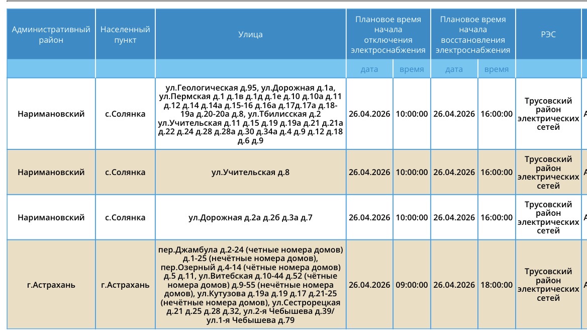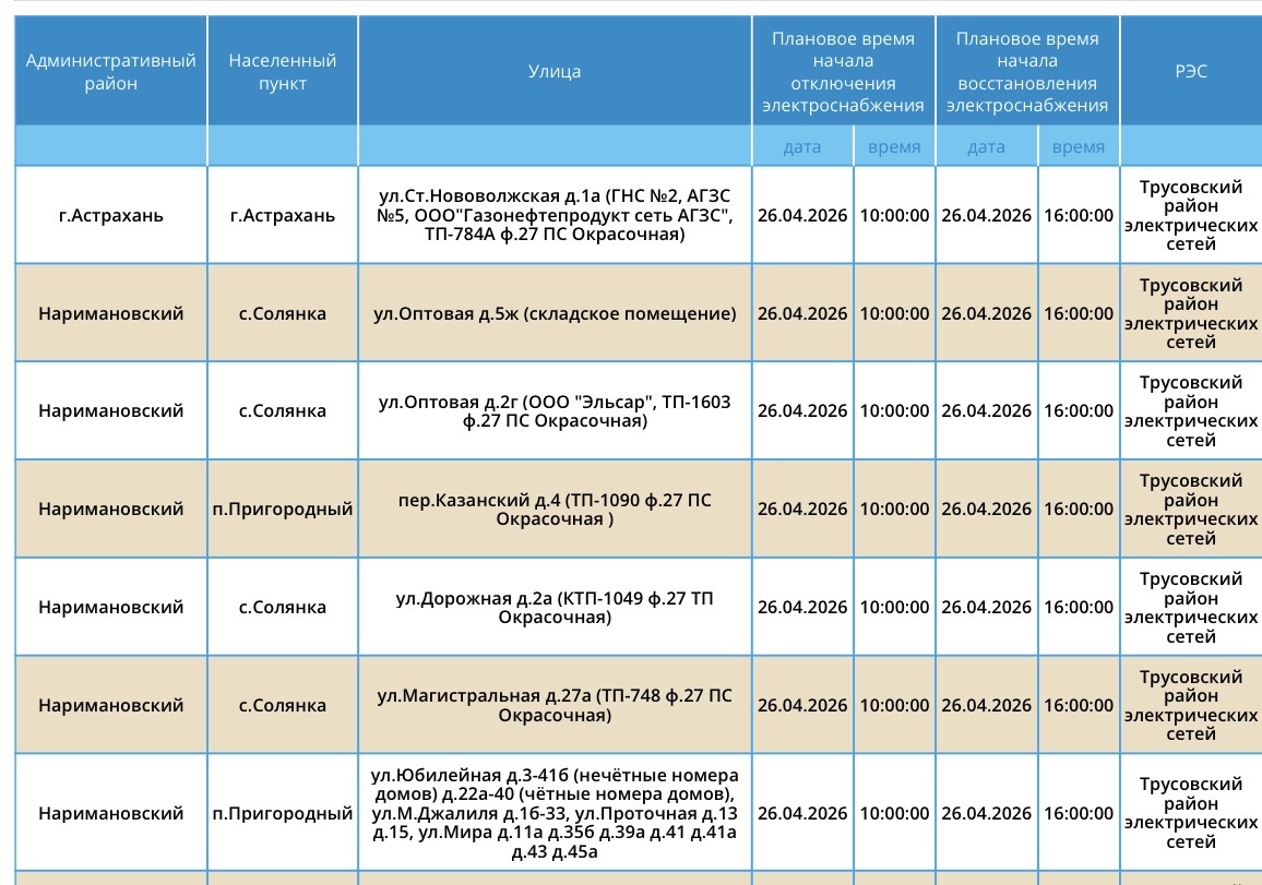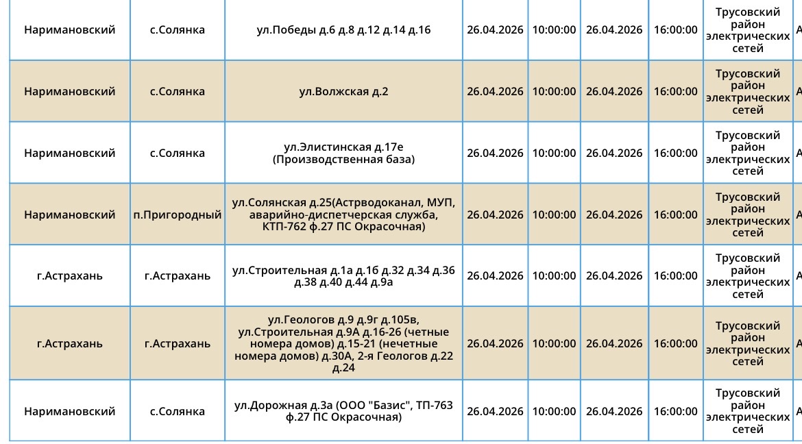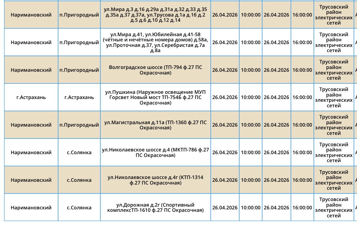 В воскресенье, 26 апреля, сотрудники ПАО «Россети Юг» проведут плановые работы на электросетях. Из-за этого тысячи астраханцев останутся без электроэнергии. Так, света не будет у некоторых жителей Астрахани и Наримановского района области. Отключения затронут дома, спортивный комплекс, аптеку, производственную базу. Подробности в галерее ниже: Напоминаем, что следить за актуальной информацией о проблемах коммунальной сферы в городе Астрахань можно на удобной интерактивной карте. Здесь вы всегда сможете узнать свежую информацию о текущих профилактических мероприятиях, таких как временное прекращение подачи электроэнергии, воды и прочих коммунальных услуг. Если же отключение произошло неожиданно, незамедлительно обращайтесь по указанным контактным номерам телефонов: