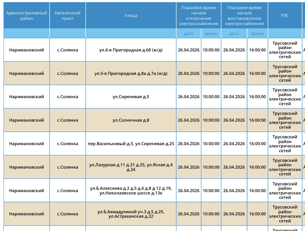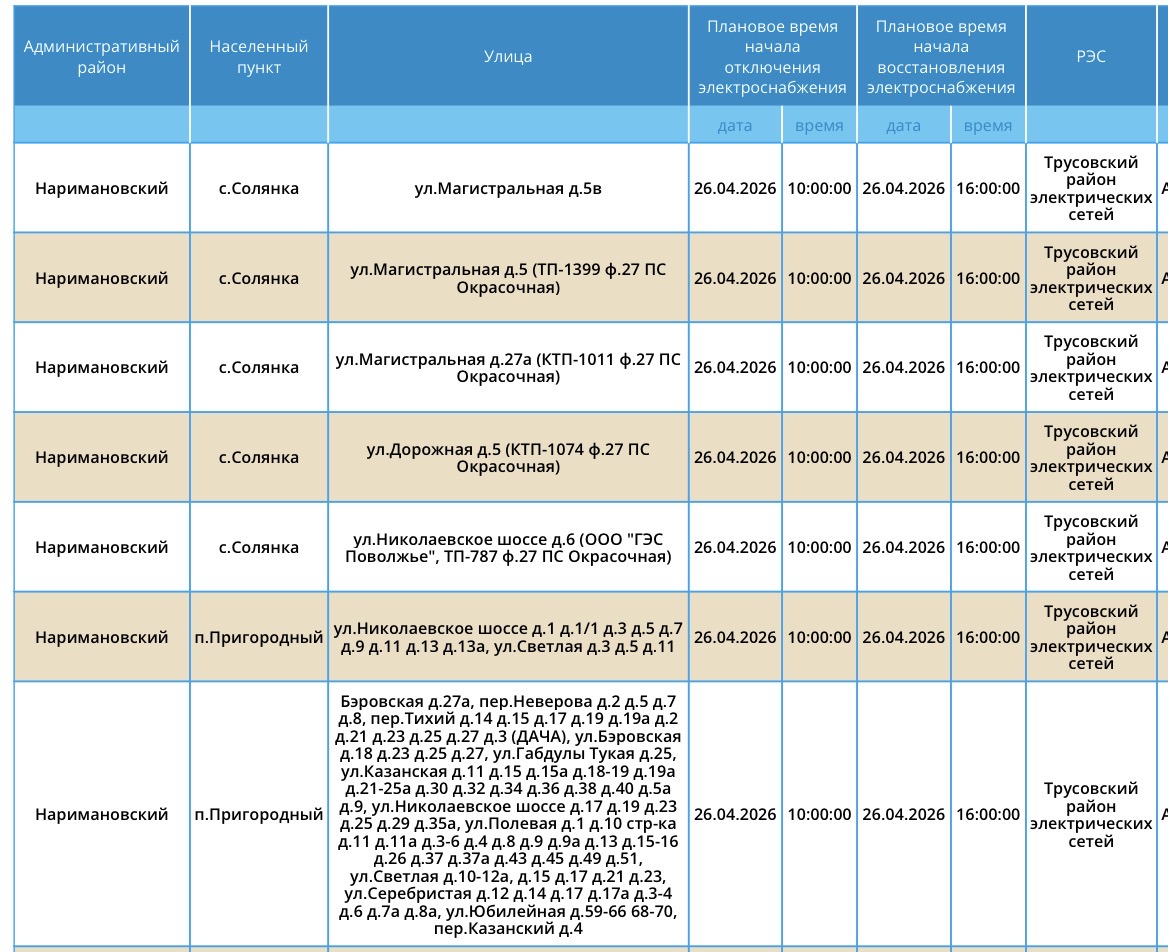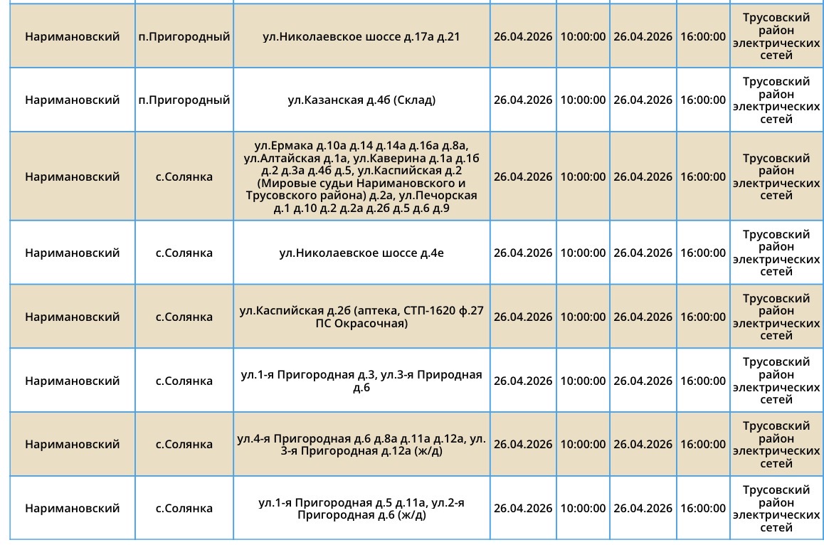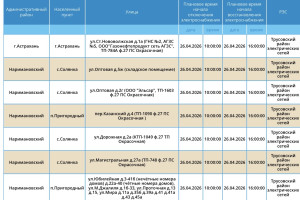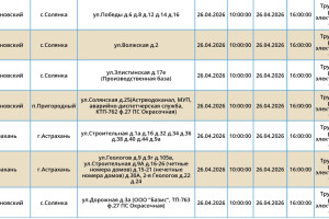В воскресенье, 26 апреля, сотрудники ПАО «Россети Юг» проведут плановые работы на электросетях. Из-за этого тысячи астраханцев останутся без электроэнергии. Так, света не будет у некоторых жителей Астрахани и Наримановского района области. Отключения затронут дома, спортивный комплекс, аптеку, производственную базу. Подробности в галерее ниже: Напоминаем, что следить за актуальной информацией о проблемах коммунальной сферы в городе Астрахань можно на удобной интерактивной карте. Здесь вы всегда сможете узнать свежую информацию о текущих профилактических мероприятиях, таких как временное прекращение подачи электроэнергии, воды и прочих коммунальных услуг. Если же отключение произошло неожиданно, незамедлительно обращайтесь по указанным контактным номерам телефонов:
