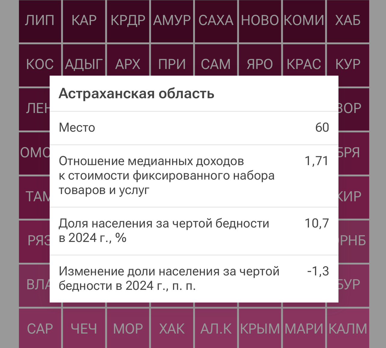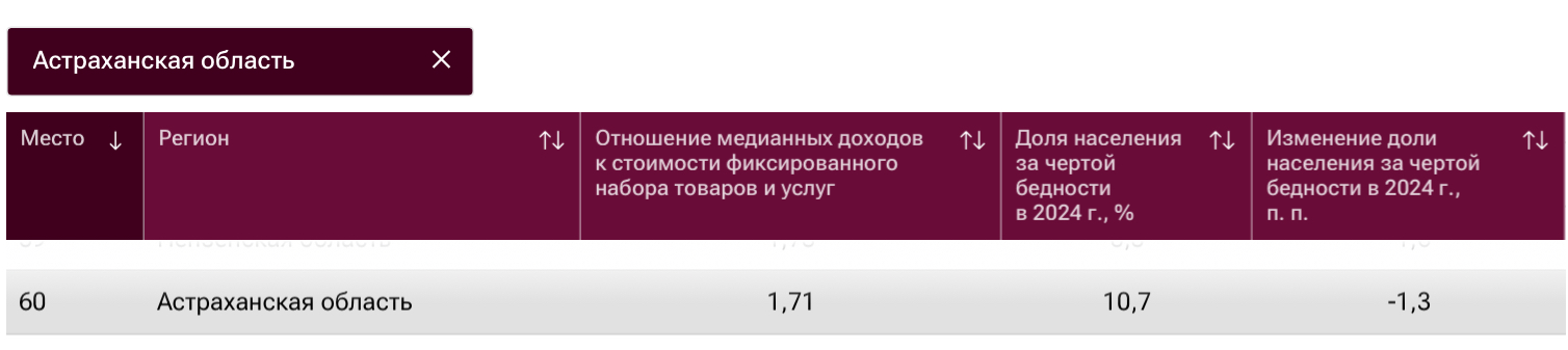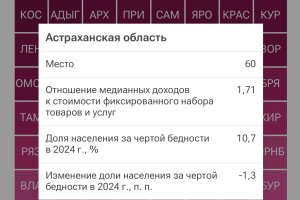 Наши коллеги из «РИА Новости» подготовили интересную статистику. По итогам прошлого года специалисты назвали регионы-лидеры и аутсайдеры по уровню доходов населения. Лидерами рейтинга стали регионы Крайнего Севера - Ямало-Ненецкий, Чукотский и Ненецкий автономные округа. Высокие показатели объяснили уровнем заработной платы в нефтегазовом секторе, повышенной северной надбавкой. А вот в конце топа оказались Ингушетия, Карачаево-Черкесия, Тыва, а также Крым. Астраханская область оказалась на 60-м месте с коэффициентом 1,71. Доля населения региона за чертой бедности в 2024 году составила 10,7%. Отметим, что медианные доходы и стоимости фиксированного набора товаров и услуг представлены данными за 2024 год. Население за чертой бедности имеет среднедушевые денежные доходы ниже официальной границы бедности. Наши соседи из Ставропольского края заняли 81 место в рейтинге (из 85), а Волгоградская область оказалась на 64 месте. Как отметили исследователи, в 2024 году реальные денежные доходы россиян выросли на 8,4%. Данный показатель напрямую связан с общим ростом экономики. А вот уровень бедности в стране продолжает снижаться: по итогам 2024 года за чертой бедности находилось 7,2% населения, что на 1,1 процентного пункта меньше, чем в 2023 году. Это минимальный показатель за последние десятилетия. В рейтинге средняя зарплата астраханцев не указывается. Но, судя по всему, высокую зарплату получать наши земляки будут не скоро. Как мы сообщали ранее, эксперты подсчитали, что через 7 с половиной лет половина астраханцев будет получать зарплату в размере 100 тысяч рублей. 75% населения с учетом покупательской способности достигнет такого дохода только через 11,3 года. Как изменится инфляция за столько лет - другой вопрос. Через сколько лет половина астраханцев будет получать зарплату в 100 тысяч рублей