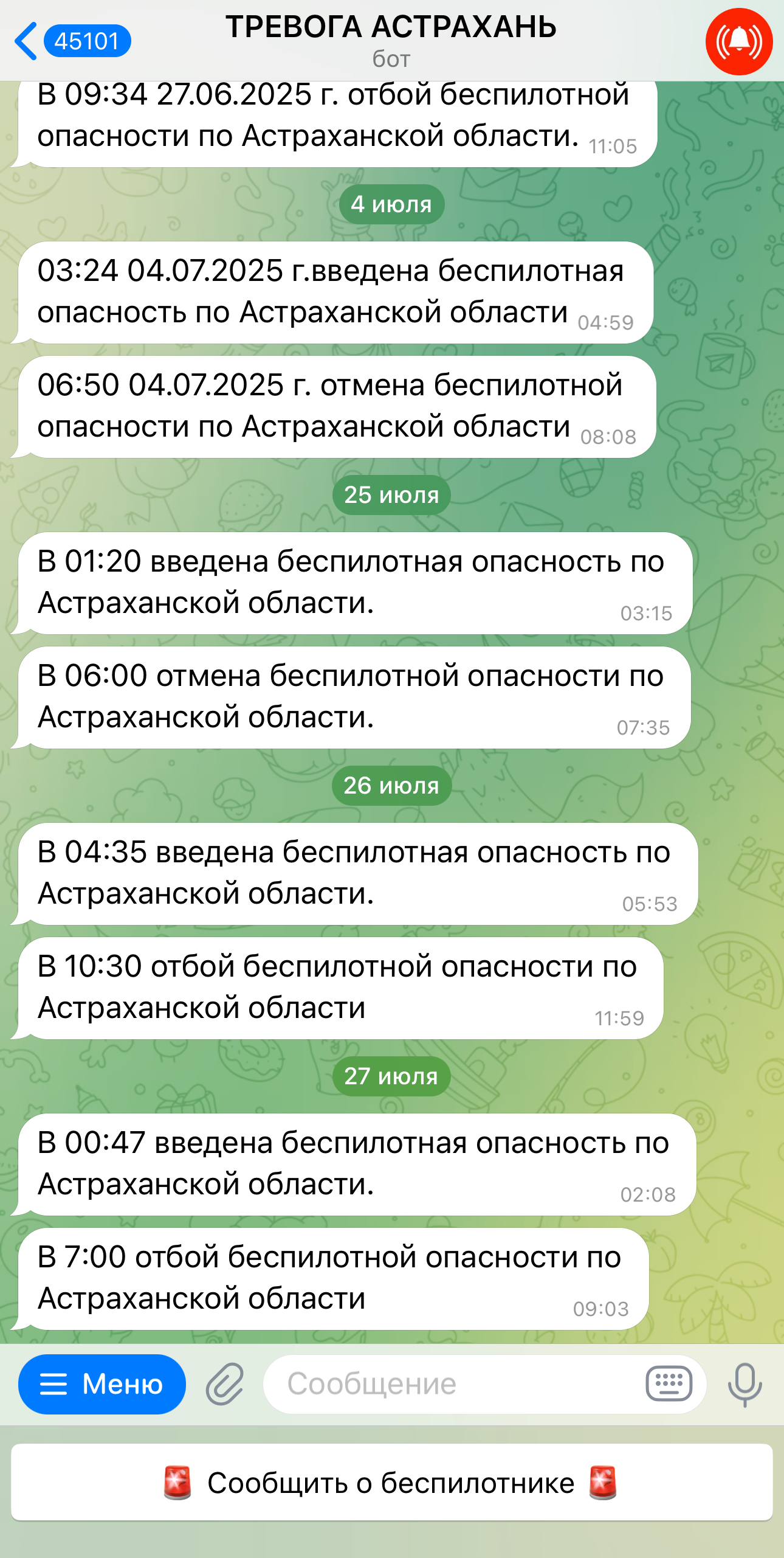 Сегодня ночью на севере Астраханской области объявляли «уровень опасности - красный» в связи с повышенной угрозой атаки беспилотных летальных аппаратов. Об этом сообщил глава города Ахтубинск Александр Сиваков в своем личном Telegram-канале. Отменен режим повышенной готовности был только утром. По словам Александра Александровича, частое применение таких мер свидетельствует о реальной угрозе. Но все не так плохо. «Мы можем быть спокойны благодаря профессиональной работе наших военнослужащих из Министерства обороны России. Выражаем им огромную благодарность за их службу», - отметил мэр Ахтубинска. А вот в популярном среди астраханцев боте «Тревога» о беспилотной опасности ни слова. Интересно, что астраханцы на протяжении долгого времени сообщают о некорректной работе канала. Выдает информацию он зачастую с задержками. Соответственно, появляется вопрос: для чего вообще нужен бот? Но, справедливости ради, есть у канала одно преимущество. Через бот можно оперативно сообщить о беспилотнике. Достаточно удобно. На данный момент о сбитых БПЛА на территории региона не сообщается. Кстати, на днях в Москве протоиерей Артемий Владимиров во время проповеди в конце богослужения назвал колокольный звон лучшим средством от дронов. Вариант, конечно, интересный, но проверенные методы борьбы с дронами надежнее. Суммарно российская ПВО уничтожила 74 украинских беспилотника за ночь, сообщили в Минобороны: 43 БПЛА - над территорией Брянской области. 22 дрона - над территорией Ростовской области. 6 беспилотников уничтожены над территорией Калужской области. 2 БПЛА – над территорией Смоленской области. 1 БПЛА – над территорией Ленинградской области. Астраханцам рассказали, что делать при угрозе атаки беспилотников