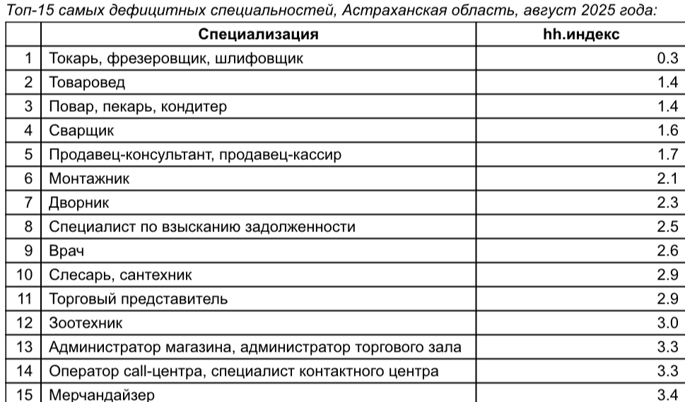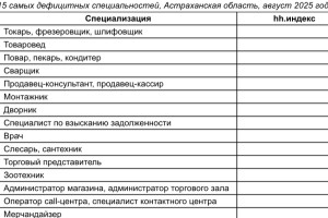 Эксперты российской платформы онлайн-рекрутинга hh.ru выяснили, какие специалисты в августе относились к наиболее дефицитным в Астраханской области. В регионе в первую десятку самых «редких» работников попали: Токари (0,3 активных резюме на вакансию). Товароведы (1,4). Повара и пекари (1,4). Сварщики (1,6). Продавцы-кассиры и продавцы-консультанты (1,7). Монтажники (2,1). Дворники (2,3). Специалисты по взысканию задолженности (2,5). Врачи (2,6). Слесари и сантехники (2,9). Сфера, где острее всего был выражен дефицит в Астраханской области в конце минувшего лета, стала розница. Всего 2,1 активных резюме на одну вакансию. Как рассказывают эксперты, ситуация на астраханском рынке в текущем году серьезно изменилась. Количество вакансий стало уменьшаться, при этом резюме растут. «В целом стал более востребован более узкий и продуманный найм, а также подбор по навыкам - термин «навыкоцентричность» все чаще звучит в среде работодателей Астраханской области. Навыкоцентричный подход помогает сфокусироваться на том, что человек реально умеет делать здесь и сейчас без строгой привязки к диплому. То, что осталось неизменным на рынке труда - это востребованность и дефицитность многих рабочих специальностей - так, из топ-15 самых дефицитных по области почти половина - «синие воротнички»», - комментирует Олеся Лавренова, директор hh.ru Юг. Вместе с тем отметим, что дефицит токарей и продавцов сохраняется уже несколько лет. К слову, в прошлом году самыми дефицитными сотрудниками в Астраханской области также являлись фрезеровщики/шлифовщики, продавцы, товароведы, риелторы, а также повара, пекари и кондитеры. Список востребованных специальностей замыкали мерчандайзеры и операторы call-центра. Кроме того, по итогам прошлого года востребованными у работодателей и дефицитными стали представители следующих специальностей: врач, торговый представитель, риелтор, мерчандайзер, агроном, автомеханик, специалист по взысканию задолженности, маляр, швея и др. Время идет, а ничего не меняется. В Астраханской области фиксируют дефицит токарей и продавцов