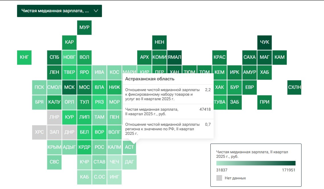 Астрахань продолжает держаться в середине рейтинга российских регионов по зарплатам. Специалисты РИА Новости подготовили рейтинг зарплат в регионах за 2-й квартал 2025 года. Результаты как всегда представлены в удобной картографической таблице, позволяющей легко определить положение каждого региона. Так, Астраханская область заняла 58 место в рейтинге с размером чистой средней заработной платы 47 тысяч 418 рублей. Соседние позиции с нашим регионом разделили Республика Адыгея и Кировская область. Волгоградская область заняла 46 место с показателем чистой медианной заработной платы 49 тысяч 838 рублей. Возглавили рейтинг Ямало-Ненецкий АО, Чукотский АО и Ненецкий АО, заняв 1, 2 и 3 места соответственно. На последнем месте оказалась республика Ингушетия с чистой медианной в размере 32 тысячи 038 рублей.