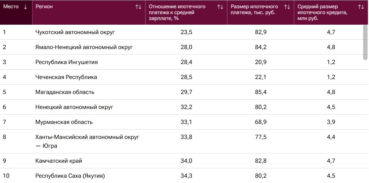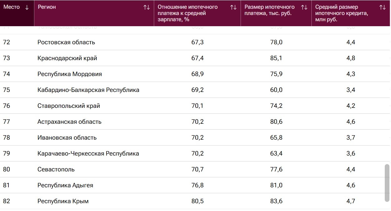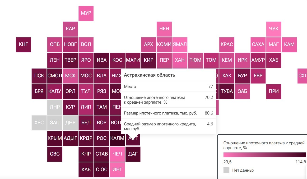Согласно исследованию РИА Новости, средний платеж по ипотеке в Астраханской области составляет 80 600 рублей. По данному параметру область заняла 77 место среди регионов России. При этом средний размер самого ипотечного кредита составил 4,6 миллионов рублей. Чаще всего астраханцам приходится отдавать 70,2% своей зарплаты, чтобы «погасить» очередной платеж по ипотеке. Похожая статистика образовалась в Ставропольском крае и в Ивановской области. Оба эти региона расположились рядом с Астраханью. Ставропольцы платят за ипотеку 74,2 тысяч рублей, что составляет те же 70,1% от заработной платы. А в Ивановской области платеж оказался приятно меньше - 65,8 тысяч рублей. Первые места рейтинга заняли, как всегда, Чукотский автономный округ и Ямало-Ненецкий автономный округ со средними значениями платежа 82,9 и 84,2 тысяч рублей соответственно.