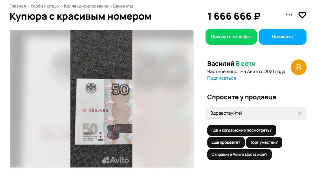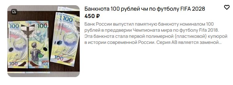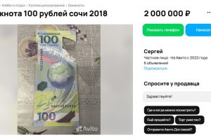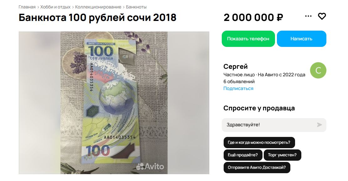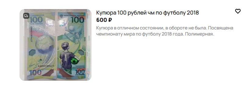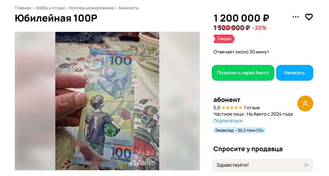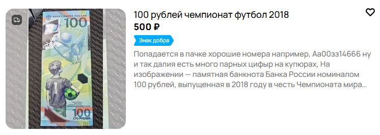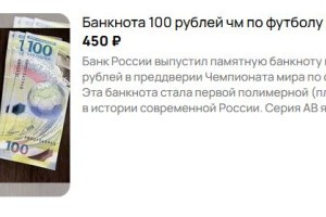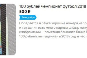 Юбилейная купюра номиналом 100 рублей была выпущена к чемпионату мира по футболу 2018 года. И, как любая лимитированная вещь, со временем обрела свою цену. На популярном сервисе объявлений есть несколько предложений о продаже памятной банкноты. Мы встретили несколько объявлений о продаже пластиковой купюры. И два нас очень удивили. Владельцы этой ничем не примечательной вещицы предлагают стать ее счастливым владельцем за 2000000 и 1200000 рублей. Скажем честно, за эти деньги можно приобрести автомобиль. Поддержанный, но все же. Откуда такие амбиции - нам непонятно. Судя по всему, такие банкноты спросом не очень пользуются. Да и приобрести их можно за куда меньшие деньги - на том же сайте объявлений есть предложения от 450 рублей за купюру. Также за символическую сумму в 1666666 рублей один астраханец продает банкноту номиналом 50 рублей с красивым номером. Может, пора перебрать все купюры в кошельке? Кажется, мы знаем, чем наши читатели займутся сегодня вечером.