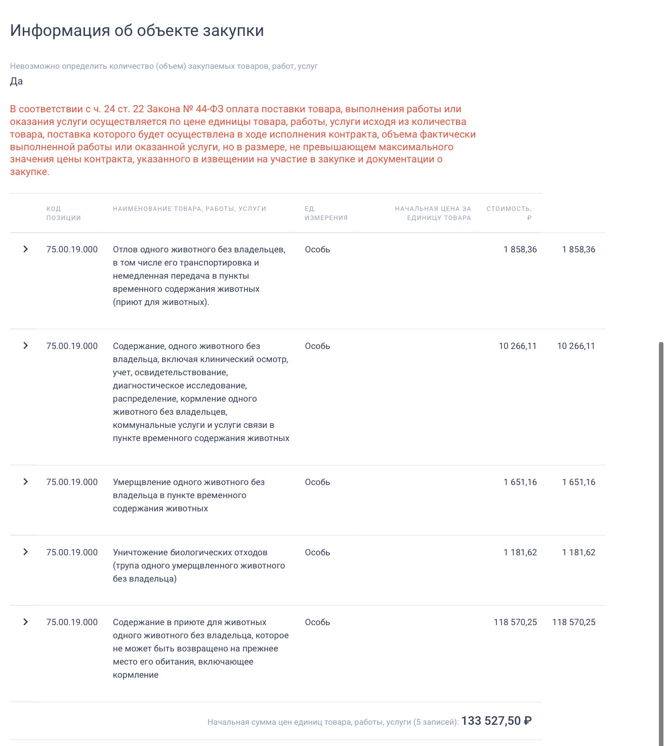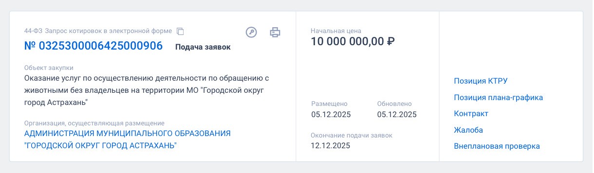 В Астрахани объявлен тендер, по которому сотни бездомных собак могут отправить на эвтаназию. Максимальная стоимость контракта - 10 миллионов рублей, и сейчас мэрия ждет подрядчика, готового взяться за работу. Закупка размещена на официальной площадке госзакупок. Заказчиком выступает городская администрация, а выполнять работы должен будет подрядчик, который займется отловом животных и их дальнейшим содержанием. Судьбу каждой собаки будут решать после карантина и ветеринарного осмотра. Согласно документации, собаку сначала отлавливают и перевозят в пункт временного содержания. Там она проведет 10 дней. В течение этого периода ветеринар обязан проверить ее состояние: есть ли опасные болезни, травмы, проявляет ли животное немотивированную агрессию.После осмотра возможны три варианта: передача в приют; поиск новых хозяев; эвтаназия - для больных или опасных животных. Стоимость контракта рассчитана по позициям. Вот сколько город готов заплатить за одну особь: Отлов и доставка - 1 858,36 рублей; Содержание и ветеринарный осмотр (10 дней) - 10 266,11 рублей; Эвтаназия (при необходимости) - 1 651,16 рублей; Утилизация трупа - 1 181,62 рублей; Содержание в приюте (для тех, кого нельзя выпустить) - 118 570,25 рублей. Общая расчетная сумма на одно животное - 133 527,50 рублей. При этом расходы на приют закладываются только в случае, если животному нельзя вернуться на волю, но его не решили усыпить. В техническом задании указано, что умерщвлению подлежат лишь неизлечимо больные животные,и собаки, проявляющие немотивированную агрессию. Однако документация не содержит даже приблизительных расчетов: сколько собак планируют передать в приют, а сколько - на эвтаназию. При этом в Астрахани и Приволжском районе с весны действует экстраординарный режим, разрешающий умерщвление бродячих животных. Программа «отлов - стерилизация - выпуск» на этих территориях официально не применяется. По расчетам, если не закладывать расходы на содержание в приюте, за 10 миллионов рублей возможно умертвить около 668 собак. А при снижении цены на аукционе - еще больше.
