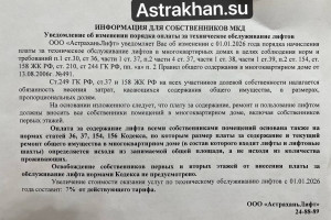 1 января 2026 года в Астраханской области, впрочем, как и по всей России, пройдет индексация тарифов ЖКХ. И местным жителям уже начали приходить квитанции с письмами «счастья». Так, с начала года цены на обслуживание лифтов в некоторых МКД повысятся сразу на 7%. Разбираемся в подробностях в нашем материале. Начнем, пожалуй, с повышения тарифов. Правительство РФ установило два периода индексации тарифов: с 1 января и с 1 октября. В начале года предельное повышение для всех регионов РФ не должно сильно ударить по кошельку, цены поднимутся всего на 1,7%, а вот уже с 1 октября увеличится стоимость сразу на 9,9%. Вместе с тем, летом по заявлению губернатора Астраханской области с 01.01.2026 по 30.06.2026 предложено не повышать плату граждан за коммунальные услуги. Итоговое решение оставалось за Правительством РФ. Так и случилось. А теперь, о наболевшем - о лифтах в Астрахани. Всем давно известно, что они оставляют желать лучшего. Плохо работают конструкции как в новостройках, так и старых домах. Обслуживающих организаций в областном центре много, однако, как стало известно нашей редакции, крупнейшая лифтовой компания планирует с 1 января 2026 года повысить тарифы сразу на 7%. И другие организации вряд ли останутся в стороне. Еще один занимательный момент из оповещения: «Освобождение собственников первых и вторых этажей от внесения платы за обслуживание лифта нормами Кодекса не предусмотрено». Жалобы на работу лифтов Астраханцы с каждым годом все чаще жалуются на плохие лифты. То они застревают, то падают или ломаются. И, судя по обращениям, халтурят сразу все обслуживающие организации. Просто какие-то компании хотят заработать побольше, а кто-то пока стесняется. Начнем с Набережной Приволжского затона. Там лифт неоднократно застревал, а зимой даже зажал коляску с ребенком. Ломается он регулярно, часто не работает. Поэтому приходится постоянно вызывать специалистов. Благо, приезжают они оперативно. В целом, ничего удивительного в плохой работе лифтов нет - они очень старые и изношенные, да и визуально оставляют желать лучшего. У нас то вообще не работают лифты, то застревают на каком-то этаже и глючат. А то и вовсе полностью не открываются. Я грешу на его возраст, лифт уже старый и ждать от него идеальной работы не стоит. Хотя в соседних домах лифты уже поменяли, а мы все еще ждем», - рассказала астраханка Анна Ф. Поступают жалобы с других улиц города. Ниже представлены некоторые из них: «Улица Куликова, 73. Дом построили, кажется, в 1988 году. А лифты запустили только спустя 11 лет эксплуатации дома. Вы только вдумайтесь в эти цифры. В этом году тоже не работали лифты в 2 подъездах несколько месяцев. Меняли тросы за счет жильцов», - пожаловался Николай В. «Улица Космонавта Комарова, 59 Б. Застройщик у нас «молодец». Проблемы с лифтом возникли с момента сдачи дома в 2023 году. Хорошо, что всего 10 этажей, а не 19. Неделями сидим без лифта», - пожаловалась Елизавета Н. «Улица Космонавта Комарова, 174 Б. Регулярно ломаются лифты во всех подъездах. Компания обслуживающая обвиняет жильцов в халатном отношении к лифтам. То жильцы кнопки зажимают, то дети прыгают, то двери ломают. Это все имеет место быть, но не каждый же день. Хотим менять организацию, нас такая работа не устраивает», - рассказала Юлия С. И вот в некоторых домах смена обслуживающей организации пошла на пользу. Речь идет о мно