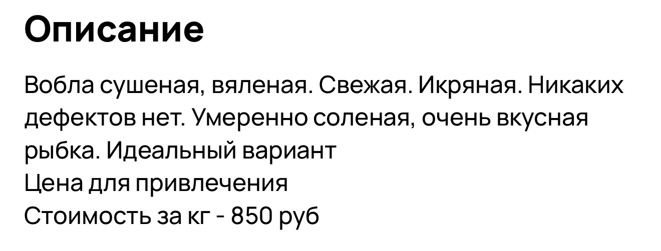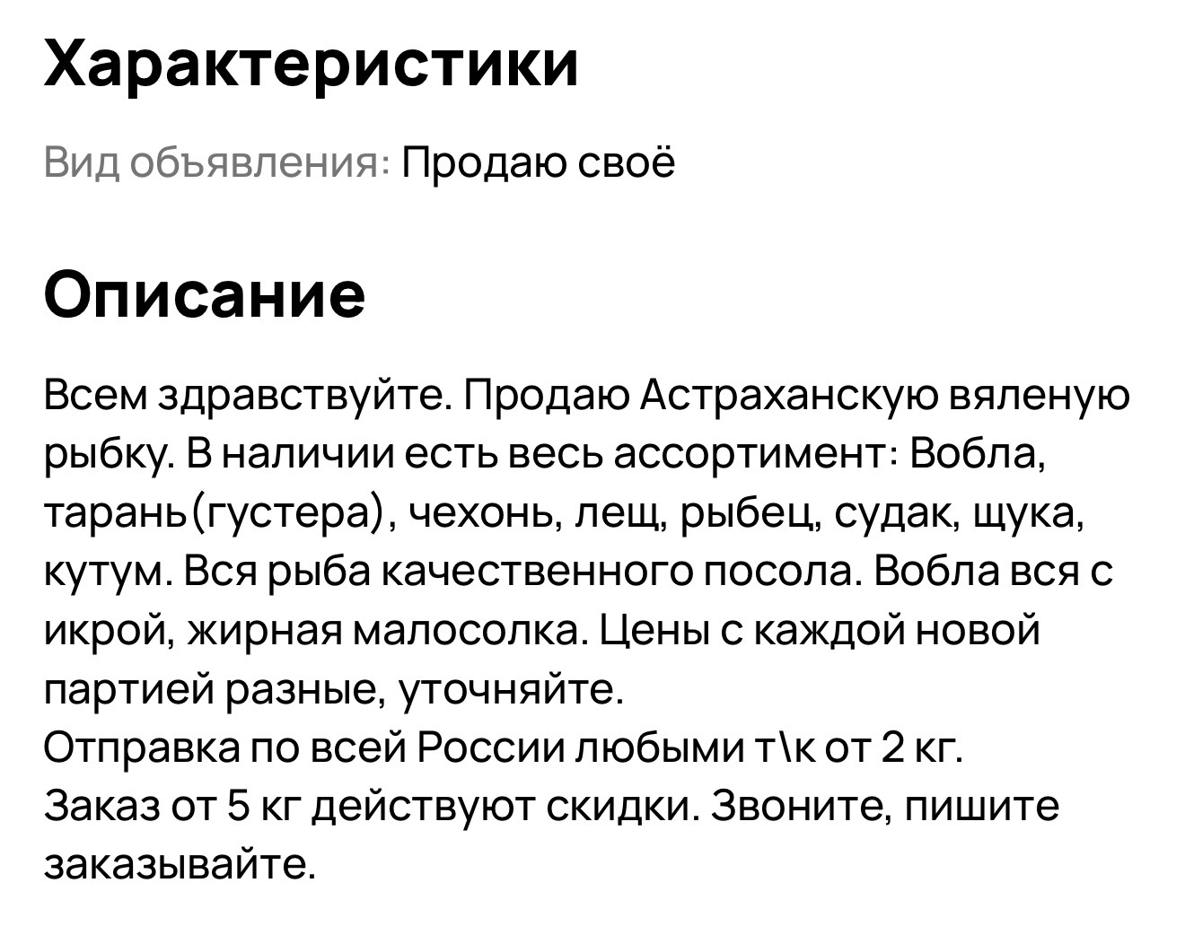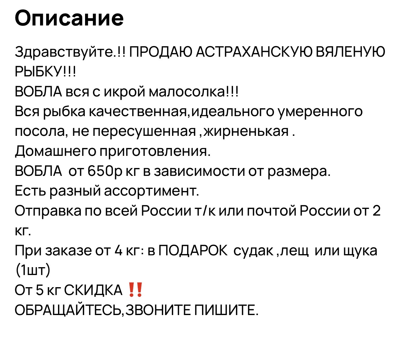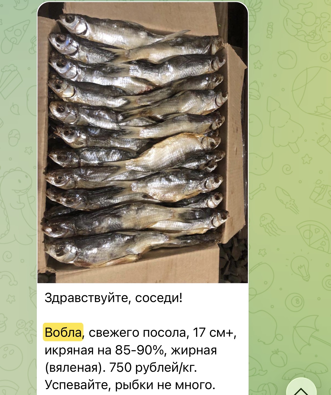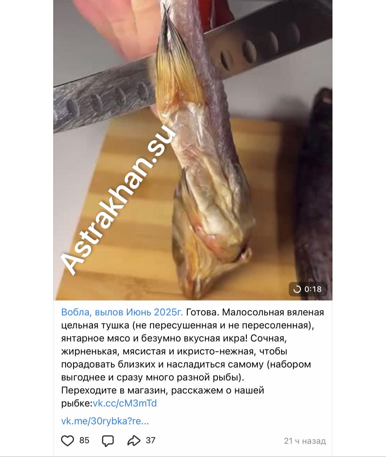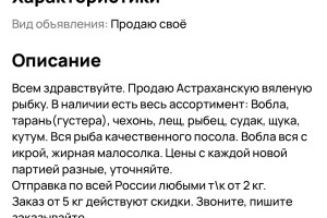 Чего только не найдешь на астраханских рынках. В том числе и «запрещенку», которой торгуют без всякого стеснения и угрызения совести. Оно и понятно - за порядком следят слабо, а безнаказанность как раз порождает подобные (осознанные) нарушения. Корреспондент нашей редакции прогулялся по популярным рыбным базарам и обнаружил огромное количество запрещенной к вылову воблы. Но это еще не все. Открыто приобрести можно и биологические ресурсы, занесенные в Красную книгу Астраханской области. Как такое может быть? Разбираемся в нашем материале. Вобла «в законе» Начнем с символа Астраханской области, который совсем скоро может кануть в Лету. Продается вобла на «Селенских Исадах», «Татар-Базаре», и даже на блошином рынке. Кто во что горазд. Стоит рыба в среднем от 150 до 650 рублей за штуку. Все зависит от ее размера, жирности и наличии икры. Продавцы обещают, что вобла - лучшее лекарство от морщин, потери зрения и плохого настроения. Лечит она все, даже кошельки предпринимателей-нелегалов. В наличии также лещ и судак за 700 рублей, жерех за 1300 рублей, тарашка за 200 рублей. Рыбы много, можно было бы и обойтись без «запрещенки». Но деньги, как известно, «не пахнут». «Прихожу на рынок за деликатесами. А тут столько нелегального. Появление на рынке сушеной воблы, несмотря на запрет ее вылова, у меня лично, вызывает ряд вопросов и тревогу. Во-первых, возникает сомнение относительно законности происхождения продукта. Если рыба действительно была добыта незаконно, это ставит под угрозу экосистемы водоемов и нарушает законодательство. Зачем вообще нужны запреты? Во-вторых, это демонстрирует неэффективность контроля над соблюдением природоохранительных мер. Необходимо усилить контроль за рынками, продавцами и браконьерами, предпринимателями, чтобы избежать подобных ситуаций и защитить природные ресурсы региона. Их и так осталось мало, не считаете?» - негодует астраханка Таисия З. Некоторые продавцы утверждают, что поймали воблу и привезли ее из Казахстана, а также из других регионов РФ. Но в слова мы не верим, а документы нам предоставлять отказались. Выводы делайте сами. Следующая история на «Татар-Базаре» и блошином рынке: Рыбец и кутум из Красной книги Если с воблой еще можно как-то смириться, то вот с рыбцом обыкновенным, внесенным в Красную книгу Астраханской области, нет. Продается она свободно и открыто на рынке «Селенские Исады». Стоит одна рыбка 250 рублей, что крайне недорого для такого риска. Продавцы, конечно, никаких документов не предоставляют и утверждают, что поймали биоресурс в Казахстане. Какие могут быть вопросы? Аналогичная история и с рыбой кутум. Стоит она, внимание, по 3 тысячи рублей. Экологи стараются охранять рыбу на путях естественной миграции, пытаются восстановить запасы. Но у браконьеров другие планы. Такими темпами в Красную книгу введут и воблу. А что в Интернете? Продают активно свежую астраханскую воблу, рыбца и в Интернете. В частности, в социальных сетях магазины рекламируют самый свежак, осенний вылов и посол. Не брезгуют и продажей рыбца. Вот примеры реклам, которые появились у корреспондента нашей редакции: Активно распространяют воблу и через сайты бесплатных объявлений. Мы сообщали об этом неоднократно, но никакой реакции профильных служб, никаких контрольных закупок. Как продавали - так и будут продавать. Тогда д