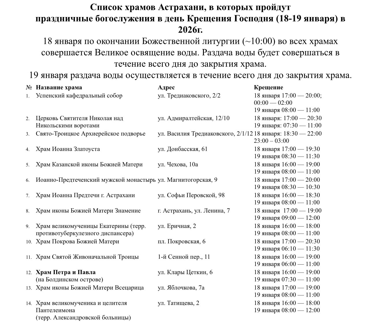 На выездном межведомственном совещании, организованном администрацией Астрахани, обсудили подготовку к одному из главных православных праздников. Участие в нем приняли чиновники, представители духовенства, правоохранительных органов, системы здравоохранения, спасатели, медики. В 2026 году будет обустроено четыре купели - по одной в каждом районе города. Расположатся они по следующим адресам: На Набережной Тимирязева/улице Соймонова (береговая линия Прямой Болды). На Набережной Приволжского затона, 13/2 (напротив здания администрации Советского района). На Серебряной Воложке (по адресному ориентиру улице Чкалова, 95Г). Главная купель расположится на набережной Волги, прямо напротив гостиницы«Азимут». Именно там будет конечная точка маршрута крестного хода, который стартует ночью с 18 на 19 января от Пречистенских ворот кремля после завершения торжественного богослужения в Успенском кафедральном соборе. Всего на Крещение праздничные службы пройдут в 28 храмах города. Дно водоемов обследуют водолазы. Будут установлены обогреваемые палатки для переодевания, территории празднично украсят, смонтируют освещение. Совершить обряд крещенского купания можно с 20:00 18 января до 22:00 19 января. В это время у купелей будут дежурить водолазы, спасатели и полиция. Чтобы избежать несчастных случаев, администрация Астрахани просит окунаться только в специально подготовленных для этого местах.