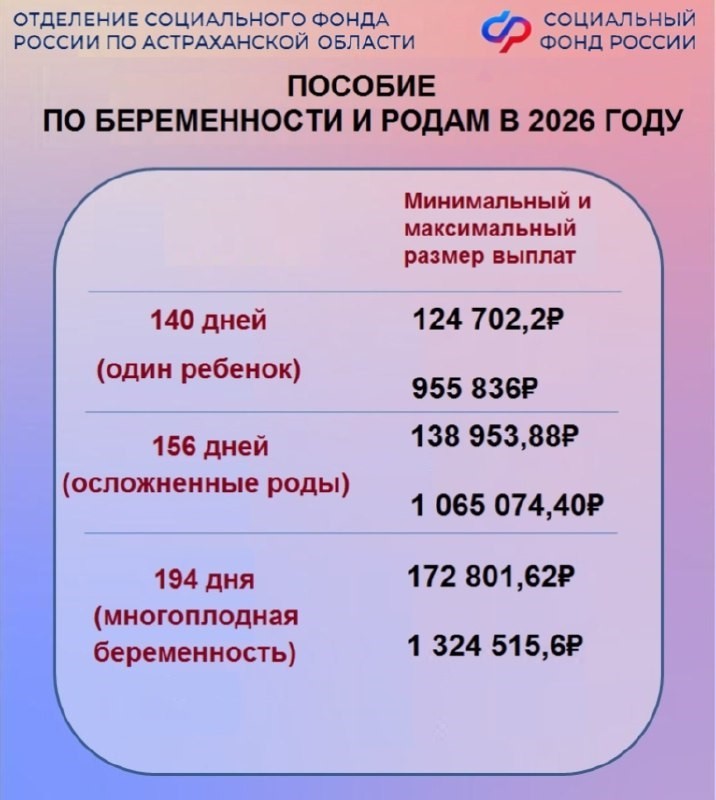 С начала 2026 года семьи, ожидающие рождения ребенка, будут получать увеличенные пособия по беременности и родам. Пособие по беременности и родам рассчитывается путем умножения среднего дневного заработка женщины на количество дней отпуска по беременности и родам. Данный вид госпомощи предоставляется следующим категориям: официально трудоустроенным женщинам, которые родили или усыновили ребенка в возрасте до трех месяцев, студенткам высших учебных заведений, обучающимся очно, женщинам, проходящим военную службу по контракту, женщинам, уволенным в течение года после ликвидации организации и признанным безработными в этот период. Отметим, что за пособием может обратиться один из родителей, а также другой родственник или опекун, находящийся в отпуске по уходу за ребенком. Выплата продолжается даже в том случае, если досрочно выйти из отпуска на полный рабочий день. Важно Пособия рассчитываются исходя из средней заработной платы и стажа. Пособие по уходу за ребенком до 1,5 лет составляет 40% от среднего заработка родителя за предыдущие два года. Также увеличен размер пособия по уходу за ребенком до 1,5 лет: максимальный размер пособия составляет 83 021 рубль, а минимальная выплата - 10 837 рублей.
