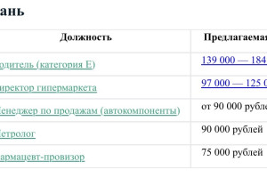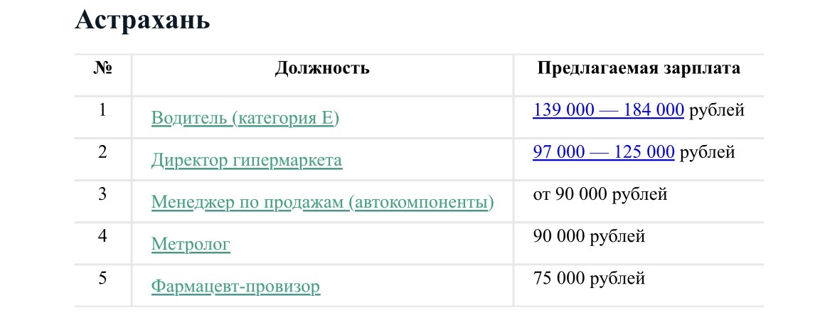 Сервис по поиску высокооплачиваемой работы SuperJob проанализировал вакансии в городах, численность населения которых составляет от 500 тысяч до 1 миллиона человек, отобрал лучшие предложения февраля. Оказалось, что в Астрахани в данный момент больше всего готовы платить водителю категории «Е». Компания предлагает зарплату до 184 тысяч рублей, бесплатное питание, ремонт ТС без участия водителя, возможность переобучения, корпоративную мобильную связь, спецодежду, бесплатный медицинский осмотр. На втором месте оказалась вакансия директора гипермаркета. Там в месяц готовы платить до 125 тысяч рублей. Требования к кандидату следующие: высшее образование, опыт работы на аналогичной должности от одного года. На третьем месте – менеджер по продажам с зарплатой от 90 тысяч рублей. Столько же платить готовы и метрологу. А фармацевт-провизор может получать по 75 тысяч рублей в месяц. В других городах ситуация иная. Например, в Саратове, Ульяновске, Иркутске, Томске, Рязани, Кирове хорошо платить готовы врачам, в Хабаровске и Астрахани нужны водители. Также в Иркутске в топ вошла вакансия начальника электротехнической лаборатории, в Томске - заместителя начальника департамента, в Пензе - руководителя филиала.