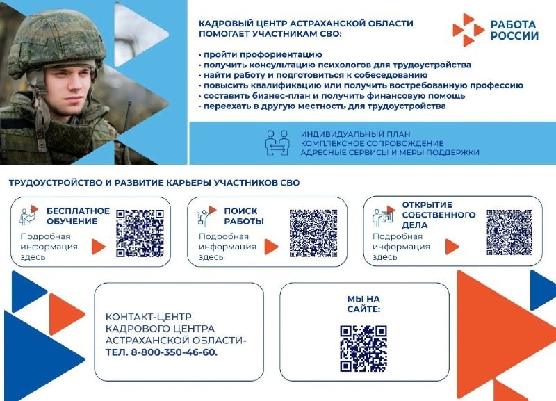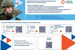 Чтобы помочь местным жителям, вернувшимся с СВО, адаптироваться к мирной жизни и начать трудовой путь, работают кадровые центры по переподготовке. Региональные кадровые службы совместно с фондом «Защитники Отечества», а также реабилитационными центрами «Русь» и «Тинаки» разрабатывают комплексную систему поддержки ветеранов специальной военной операции. Эта система охватывает профессиональную и социальную интеграцию, психологическую помощь и содействие в трудоустройстве. Благодаря таким мерам астраханцы могут планировать свое будущее и быстрее возвращаться к активной трудовой деятельности. В 2025 году при содействии службы занятости работу нашли 34 участника специальной военной операции. Для их успешной адаптации организованы краткосрочные программы профессионального обучения и повышения квалификации (продолжительностью не более трех месяцев) по специальностям, востребованным на региональном рынке труда. Получить нужную консультацию можно в рабочие дни по телефону кадрового центра Астраханской области: 8‐800‐350‐46‐60. С декабря прошлого года во всех кадровых центрах области функционирует клуб «Поддержка СВОих». Основная цель клуба - всесторонняя поддержка участников: от помощи в составлении резюме и поиска вакансий до содействия в построении карьеры и предоставления дополнительных возможностей для профессионального развития.