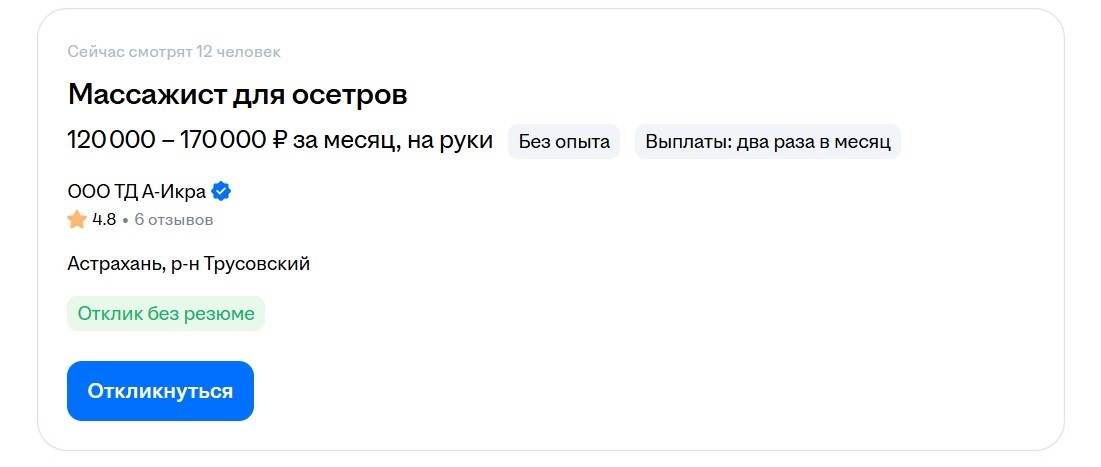 Пока кто-то ищет работу мечты, астраханский работодатель ее предлагает. На этот раз в Астрахани ищут специалиста, который будет делать массаж осетрам. И платят за это, кстати, весьма прилично. Местная икорная компания «А-Икра» ищет сотрудника на должность массажиста для осетров. Зарплата - от 120 тысяч до 170 тысяч рублей в месяц. И самое приятное для соискателей - опыт работы не требуется. Такое необычное объявление заметили наши коллеги из «Арбуза». Как пояснили в компании, это - не шутка. Такая работа действительно существует и напрямую связана с получением черной икры. Причем методом, который называют прижизненным - то есть максимально бережным для рыбы. В обязанности будущего специалиста входит «деликатное получение икры методом доения». Проще говоря - аккуратный массаж, который требует не только силы, но и точности. Кроме того, сотруднику предстоит контролировать «давление и ритм», чтобы процесс был комфортным для осетра и эффективным для производства. Также нужно следить за состоянием рыбы - оценивать уровень стресса и общее самочувствие. Есть и приятный бонус: участие в финальной дегустации продукта. Да, результат своей работы можно будет попробовать. Требования к кандидатам тоже звучат колоритно. Среди них - сильные руки, развитые большие пальцы, высокая чувствительность и стрессоустойчивость. Последнее особенно важно, ведь, как честно предупреждают в компании, «осетр - не клиент спа, может возражать». Отдельно отмечается, что кандидат должен спокойно относиться к работе с живыми организмами и не иметь аллергии на рыбу и икру. А вот чувство юмора - не просто плюс, а почти необходимость. К слову, это не первый раз, когда «А-Икра» удивляет астраханцев. В прошлом году компания уже искала дегустатора черной икры - тогда вакансия тоже вызвала немало улыбок. Так что тем, у кого крепкие пальцы, устойчивая психика и желание попробовать себя в по-настоящему необычной профессии, стоит поторопиться. Похоже, конкуренция за место «осетрового массажиста» может оказаться неожиданно высокой.