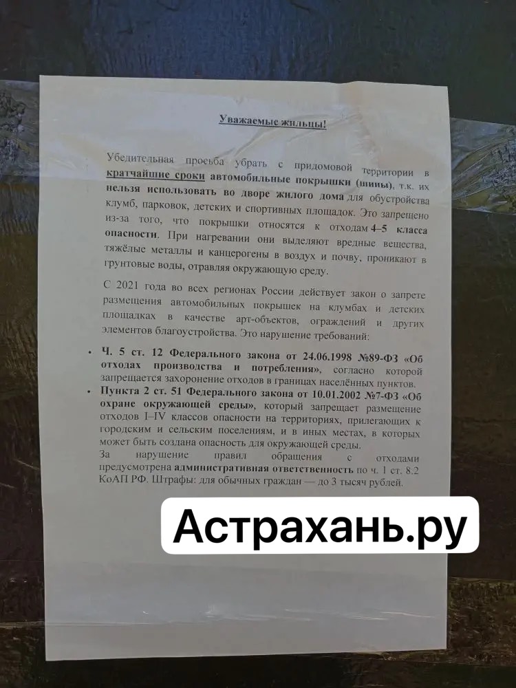 Во дворах многоэтажных домов сейчас настоящая весна. Все расцветает и благоухает. В этом, безусловно, огромная заслуга неравнодушных местных жителей, которые пытаются всячески благоустроить территорию собственными силами. Кто-то разводит клумбы, кто-то сажает цветы. Но, как известно, инициатива наказуема. Подробности - в нашем материале. Управляющие компании Астрахани начали активно рассылать астраханцам предупреждения о необходимости убрать с придомовой территории автомобильные покрышки, так как их нельзя использовать для обустройства клумб, парковок, детских и спортивных площадок. Сделать это надо в кратчайшие сроки, в противном случае - штраф. Подробнее с текстом объявления можно ознакомиться ниже: «Я уже несколько лет подряд облагораживаю наш двор - делаю из старых покрышек красивые клумбы, высаживаю цветы. И двор сразу становится уютнее, и шины не валяются где попало! А теперь управляющая компания вдруг запретила мне этим заниматься, говорит, что это нарушение. Но ведь я не мусорю, а наоборот - делаю двор красивее! У нас весь город в этих покрышках, а претензии мне. Вообще перестану во дворе что-то делать, пусть УК цветы сажает», - с сожалением рассказывает астраханка Валерия Г. Читайте также: Герань от сглаза и георгины для привлечения денег: какие цветы сейчас модно сажать на даче и у дома Используют покрышки не только в качестве клумб, но и для ограждения парковочных мест: Активно скидывают покрышки и в местные каналы. Но здесь об экологии почему-то никто не говорит: Несмотря на красоту, использование старых автомобильных покрышек для украшения клумб и создания декоративных фигур (например, лебедей) во дворах и на придомовых территориях запрещено законом. Такие действия, по данным юристов, расцениваются как несанкционированное размещение отходов, поскольку использованные шины относятся к отходам IV класса опасности. Наказание следующее: За первое нарушение - штраф от 2000 до 3000 рублей. За повторное нарушение - от 3000 до 5000 рублей. «Ответственность наступает независимо от того, украшают ли шины клумбу или просто лежат во дворе. С 2021 года надзорные органы и суды однозначно трактуют такие действия как нарушение, если только покрышки не были предварительно переработаны в безопасную крошку (что в бытовых условиях невозможно)», - указал юрист, опрошенный корреспондентом издания Астрахань.ру. Читайте также: Кто сажает цветы и деревья на набережных астраханских каналов Атака покрышек Есть еще одна проблема. С начала весны количество отработанных покрышек резко возросло, однако выбрасывать их на контейнерные площадки запрещено законом. Такие отходы не относятся к твердым коммунальным отходам (ТКО) и требуют отдельного сбора и передачи специализированным организациям, имеющим лицензии на обезвреживание и переработку. Неправильная утилизация шин наносит вред экологии и повышает пожароопасность. Сдать старые покрышки можно в шиномонтажных мастерских или в специальных пунктах приема. Стоимость утилизации составляет примерно 400-500 рублей за комплект из четырех колес. За незаконный выброс шин предусмотрены штрафы: Для владельцев легковых автомобилей - от 10 тысяч рублей до 15 тысяч рублей. Для грузового транспорта - от 40 тысяч рублей до 50 тысяч рублей, для юридических лиц - до 120 тысяч рублей. Контроль осуществляется с помощью кам