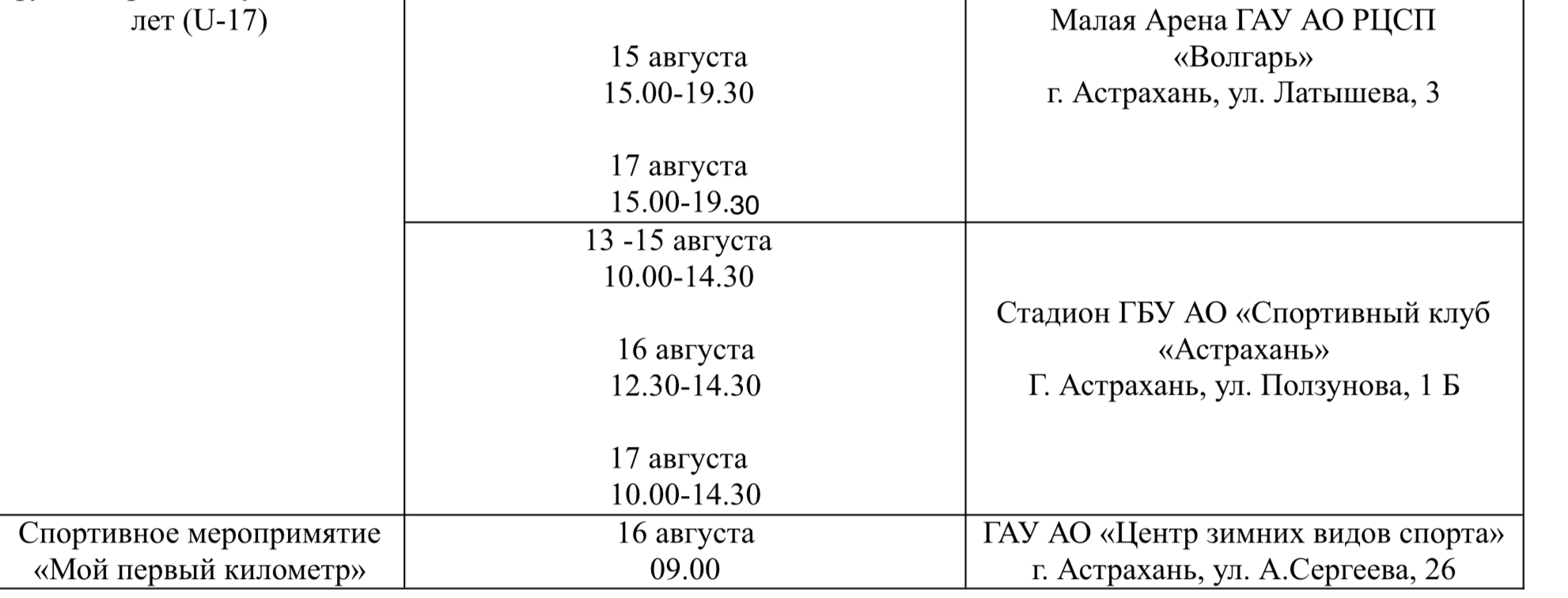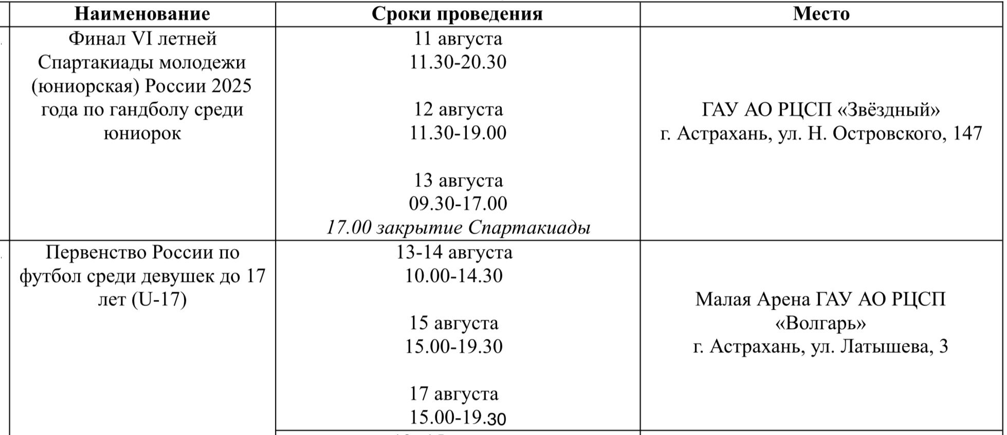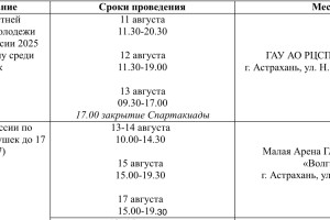 В министерстве физической культуры и спорта Астраханской области опубликовали план-график спортивных мероприятий, которые пройдут на неделе с 11 по 17 августа. Местных жителей и гостей региона ждут летняя Спартакиада молодежи, первенство России по футболу среди девушек, спортивное мероприятие «Мой первый километр», ЛЕОН-Первенство Росси по футболу среди команд Второй лиги и многое другое. Подробности ниже: