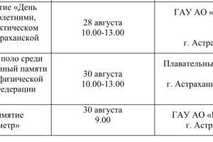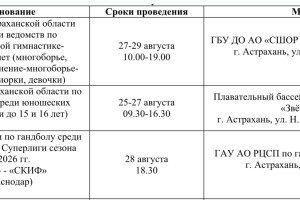 В министерстве физической культуры и спорта опубликовали план-график мероприятий, которые пройдут в Астраханской области с 25 по 31 августа. Местных жителей и гостей региона ждут чемпионат России по гандболу, первенство Астраханской области по водному поло, турнир по мини-футболу, спортивное мероприятие «Мой первый километр», областные соревнования по гребле на байдарках и многое другое: