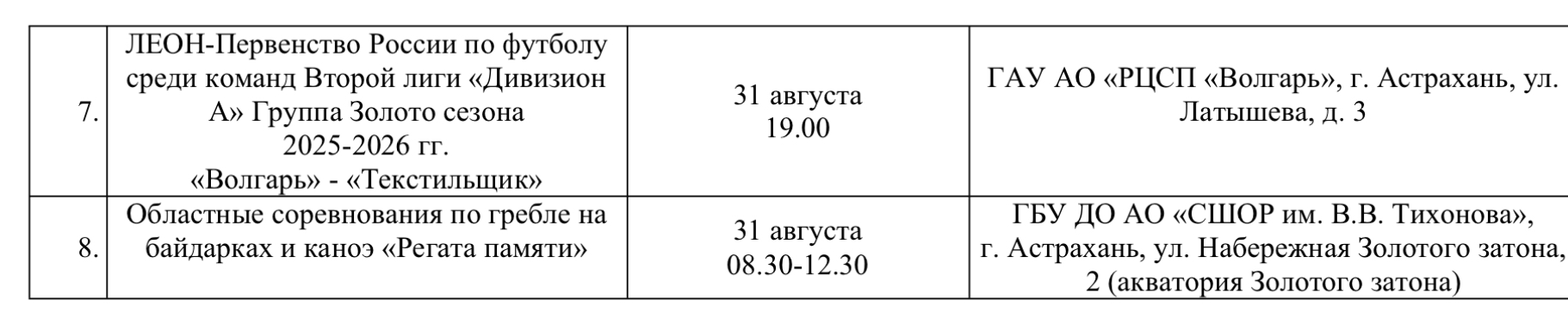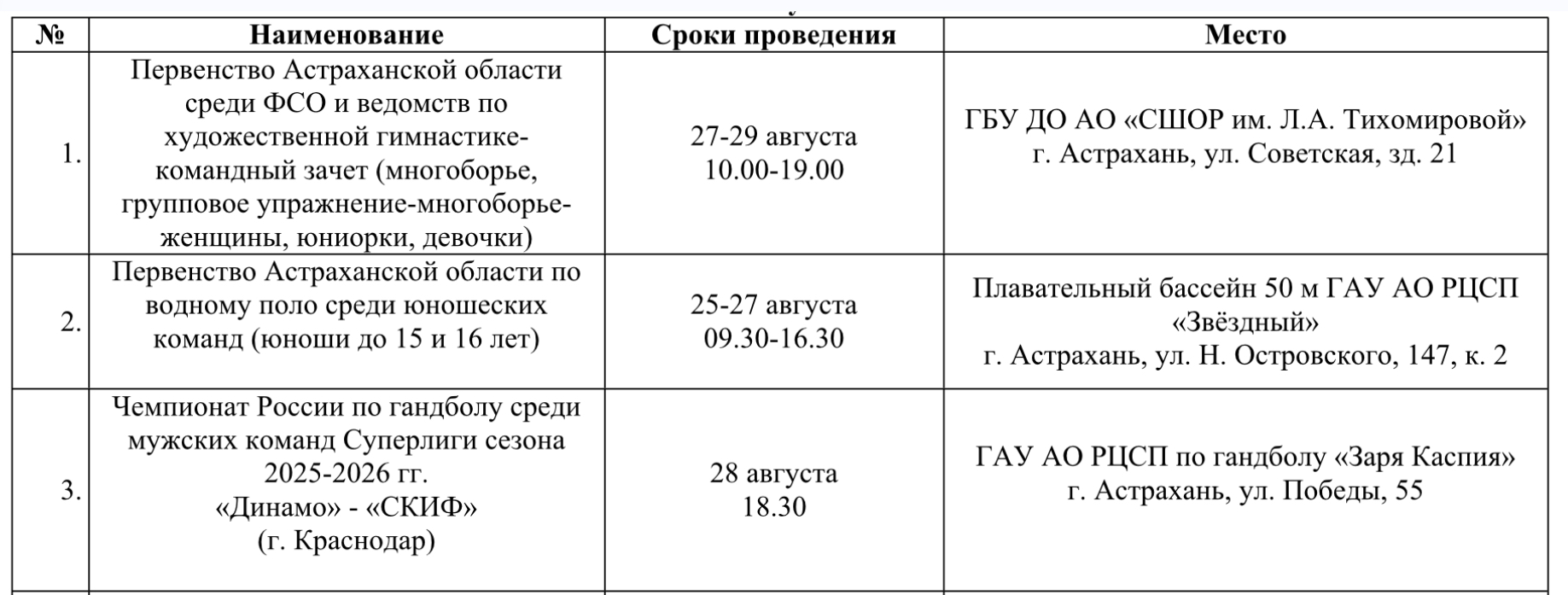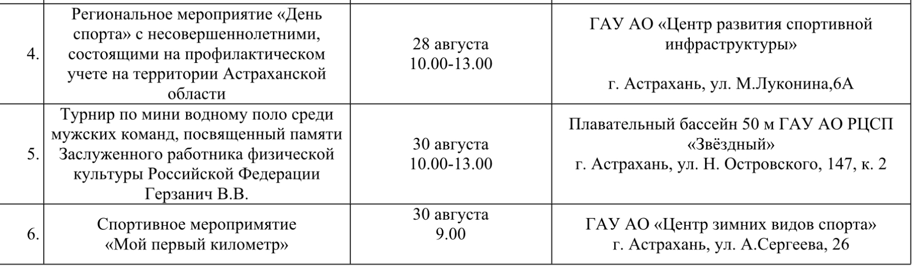 В министерстве физической культуры и спорта опубликовали план-график мероприятий, которые пройдут в Астраханской области с 25 по 31 августа. Местных жителей и гостей региона ждут чемпионат России по гандболу, первенство Астраханской области по водному поло, турнир по мини-футболу, спортивное мероприятие «Мой первый километр», областные соревнования по гребле на байдарках и многое другое: