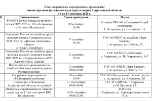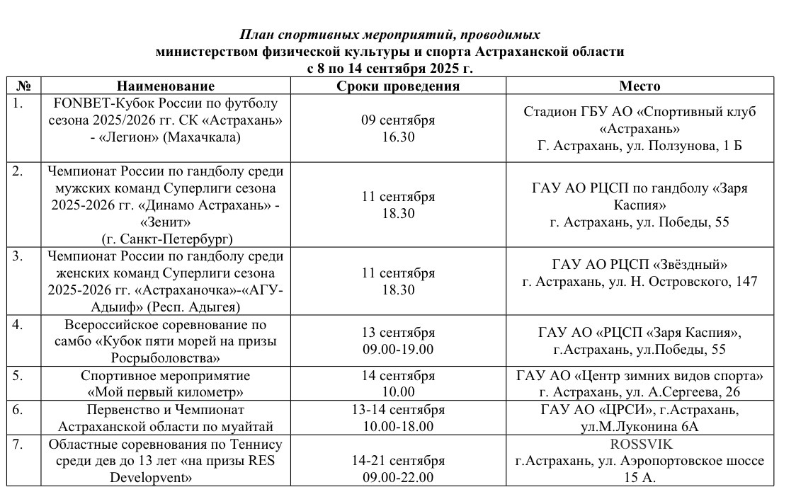 Министерство физической культуры и спорта Астраханской области опубликовало план мероприятий, которые пройдут с 8 по 14 сентября. Так, местных жителей и гостей региона ждут кубок Росси по футболу, чемпионат страны по гандболу среди мужских, а также среди женских команд, всероссийское соревнование по самбо, спортивное мероприятие «Мой первый километр» и другое. Подробности ниже: