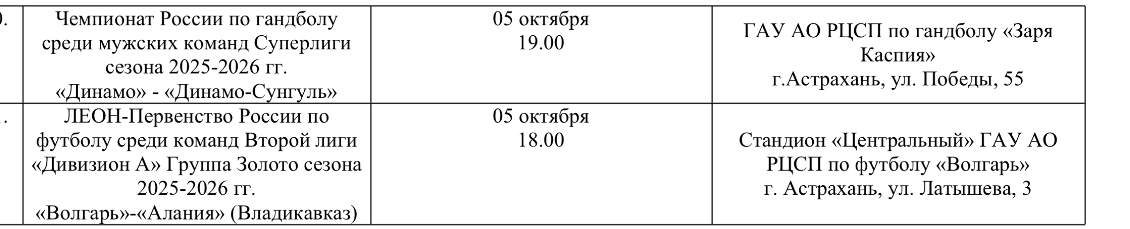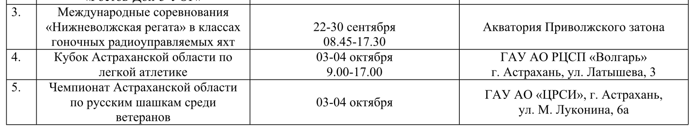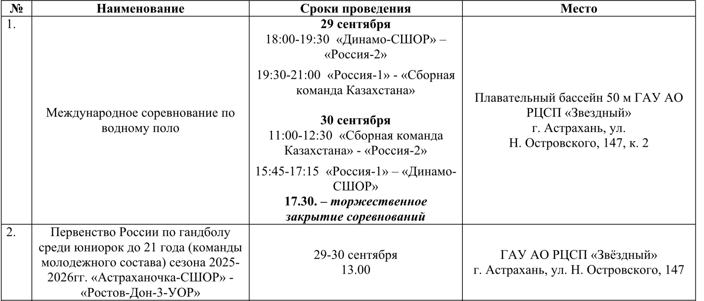 В министерстве физической культуры и спорта Астраханской области опубликовали план-график мероприятий, которые пройдут в регионе с 29 сентября по 5 октября. Так, местных жителей и гостей региона ждут международное соревнование по водному поло, первенство России по гандболу, чемпионат Астраханской области по русским шашкам среди ветеранов, кубок региона по легкой атлетике и многое другое. Подробности в галерее ниже: