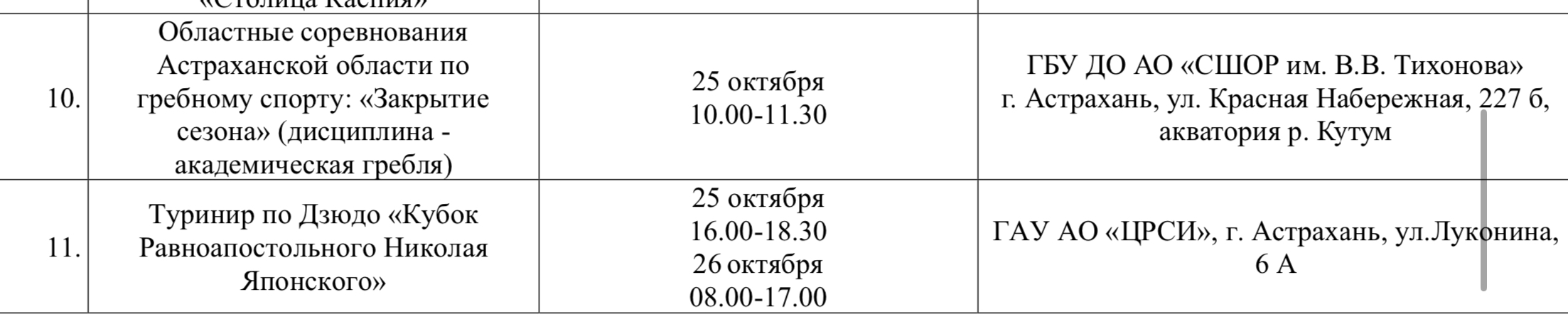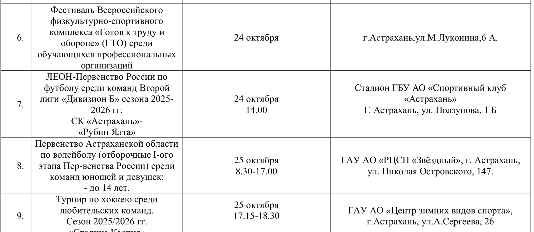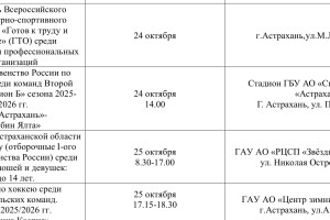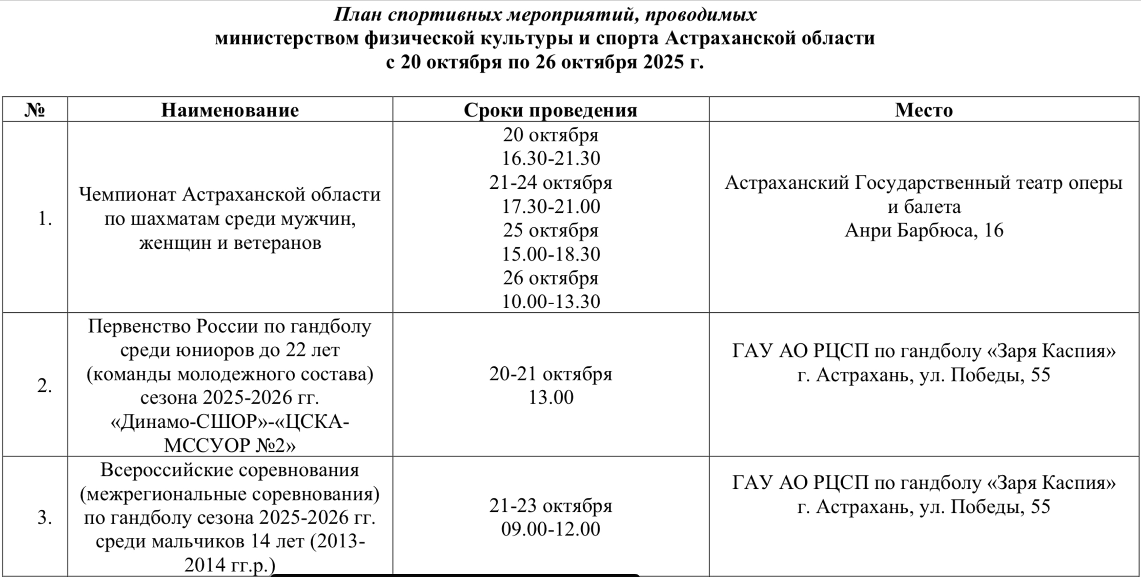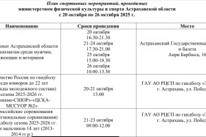 В Министерстве физической культуры и спорта опубликовали план-график мероприятий, которые пройдут на неделе с 20 по 26 октября. Астраханцев и гостей региона ждут чемпионат и первенство России по гандболу, чемпионат области по шахматам, первенство Астраханской области по волейболу, турнир по дзюдо и многое другое. Подробности в галерее ниже: