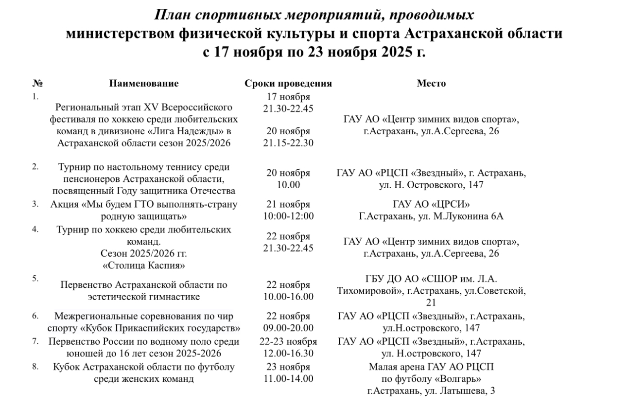 В пресс-службе Министерства физической культуры и спорта Астраханской области опубликовали план-график спортивных мероприятий, которые ждут местных жителей на неделе с 17 по 23 ноября. Так, в регионе пройдут турнир по настольному теннису среди пенсионеров, акция «Мы будем ГТО выполнять - страну родную защищать», турнир по хоккею среди любительских команд, кубок области по футболу среди женских команд, первенство региона по эстетической гимнастике. Подробности ниже: