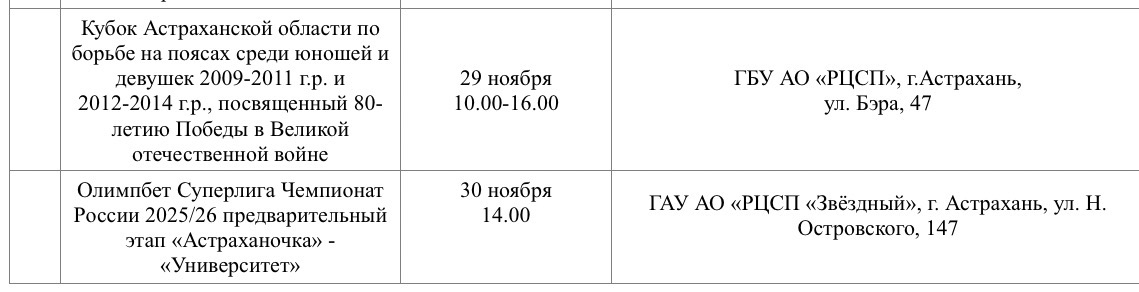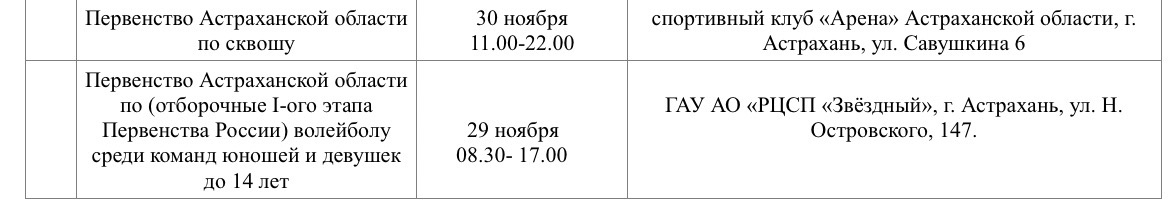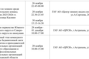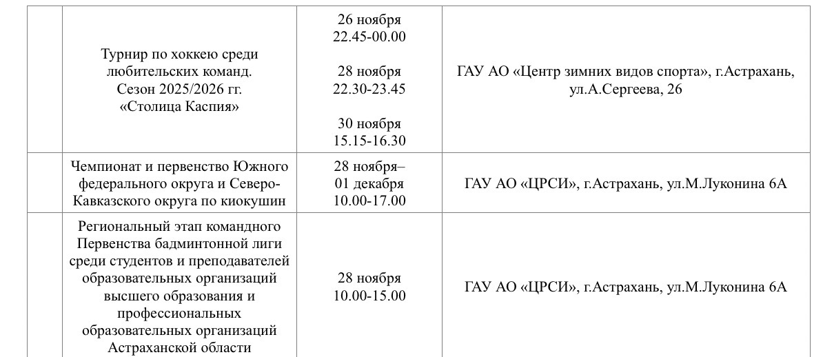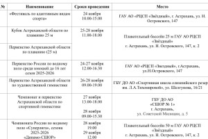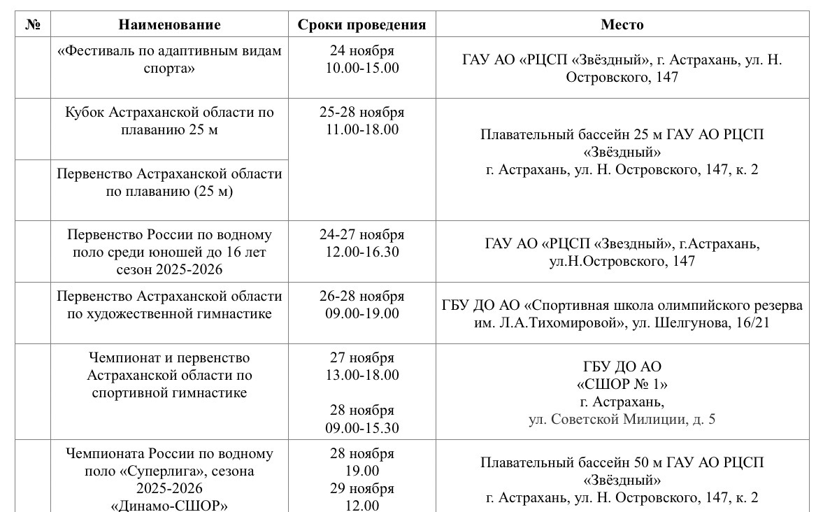 В пресс-службе регионального Министерства физической культуры и спорта опубликовали план-график спортивных мероприятий, которые пройдут с 24 по 30 ноября. Астраханцев ждут первенство области по плаванию, первенство России по водному поло, турнир по хоккею среди любительских команд, кубок Астраханской области по борьбе на поясах среди юношей, девушек и многое другое. Подробности ниже: