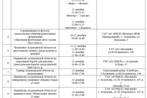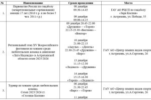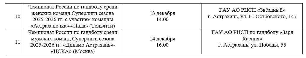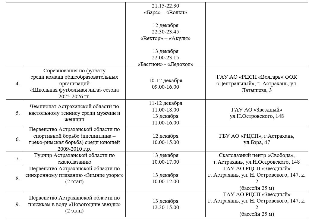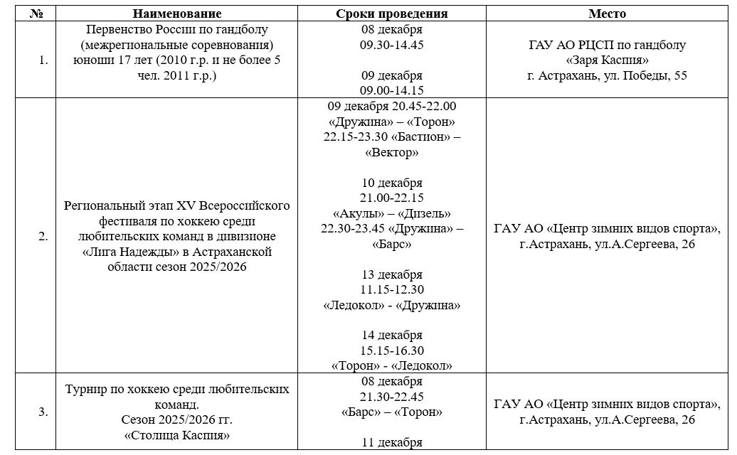 Региональное министерство физической культуры и спорта Астраханской области опубликовало план-график спортивных мероприятий, которые пройдут на неделе с 8 по 14 декабря. Для астраханцев подготовили множество интересных мероприятий, таких как Региональный этап XV Всероссийского фестиваля по хоккею среди любительских команд в дивизионе «Лига Надежды», Соревнования по футзалу среди команд общеобразовательных организаций «Школьная футбольная лига» сезона 2025-2026 гг., Чемпионат Астраханской области по настольному теннису среди мужчин и женщин. Также местные жители и гости города смогут посетить Чемпионат России по гандболу среди женских команд Суперлиги сезона 2025-2026 гг. с участием команд «Астраханочка» - «Лада» (Тольятти) и Чемпионат России по гандболу среди мужских команд Суперлиги сезона 2025-2026 гг. «Динамо Астрахань» - «ЦСКА» (Москва). Подробности о времени и местах проведения мероприятий смотрите в таблице: