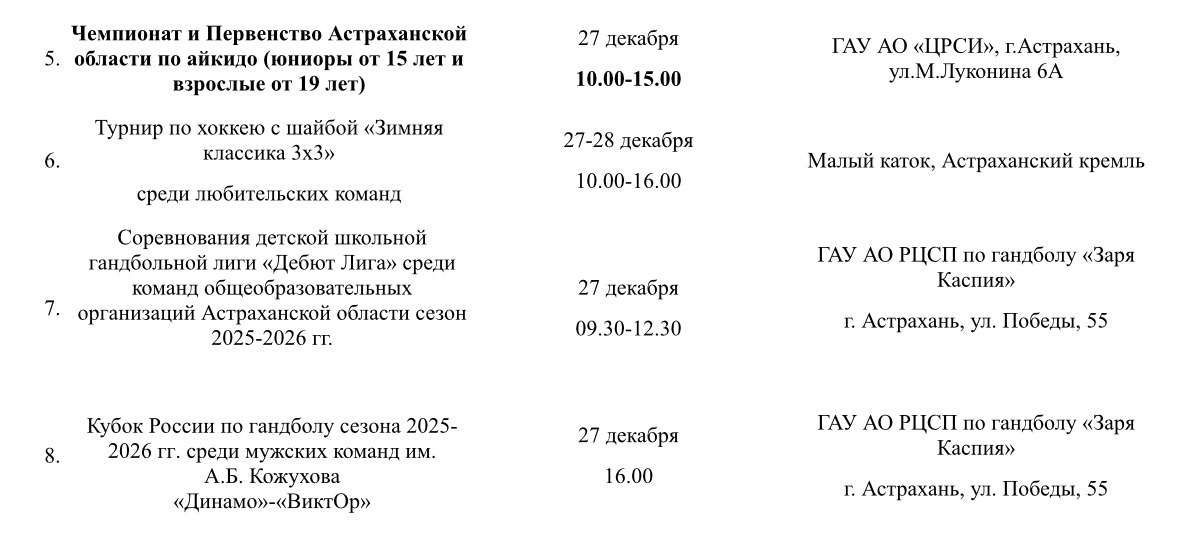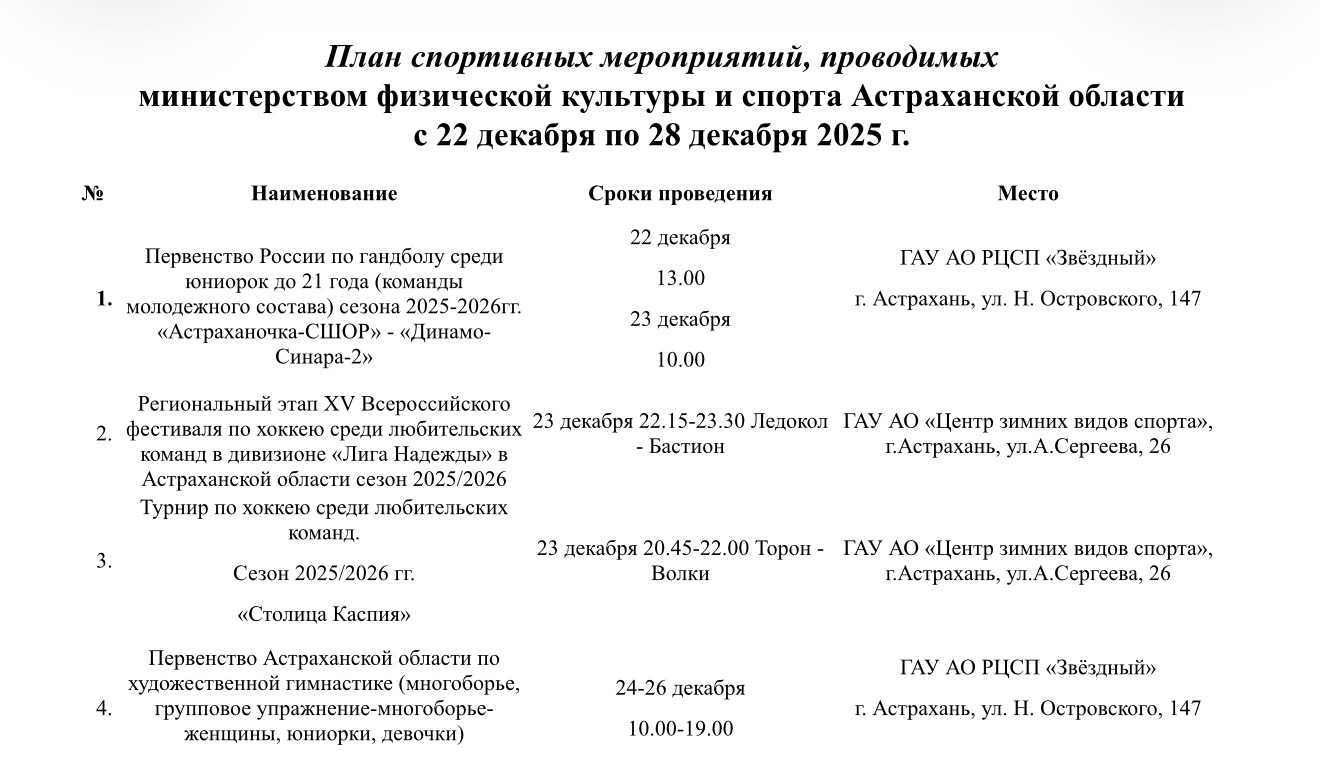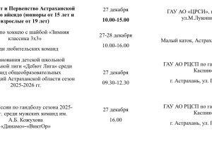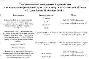 В пресс-службе Министерства физической культуры и спорта региона рассказали о главных спортивных мероприятиях региона, которые пройдут на неделе с 22 по 28 декабря. Астраханцев ждут первенство России по гандболу, первенство региона по художественной гимнастике, турнир по хоккею с шайбой, кубок страны по гандболу, соревнования детской школьный гандбольной лиги «Дебют Лига» и многое другое: