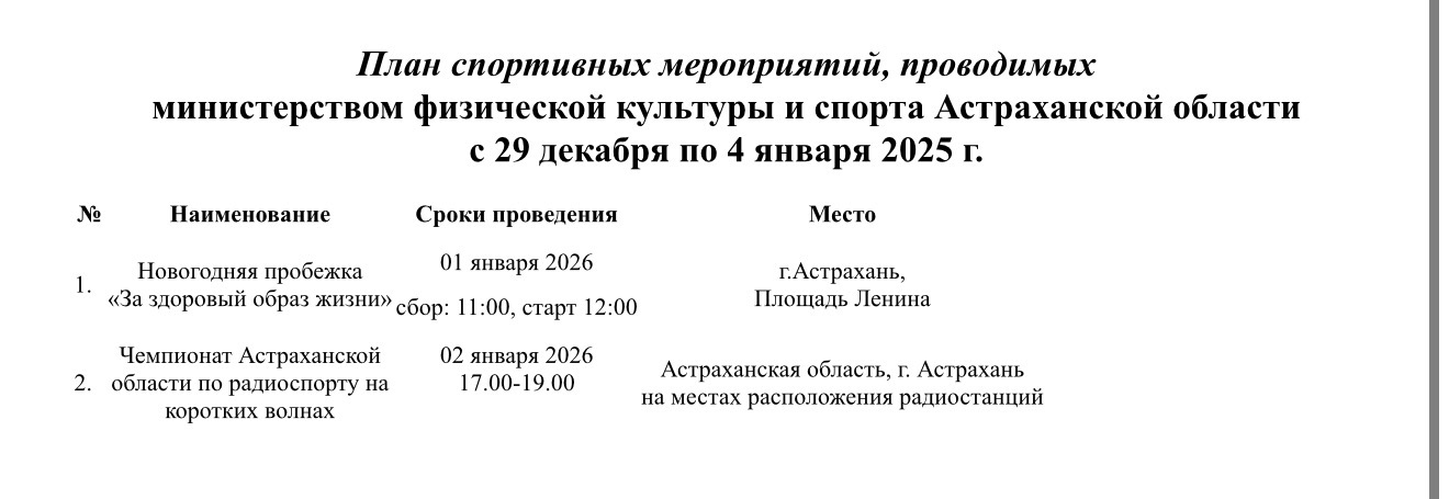 В пресс-службе Министерства спорта и физической культуре опубликовали очередной план-график мероприятий, которые пройдут в регионе с 29 декабря 2025 года до 4 января 2026 года. Спортивных событий всего два: чемпионат региона по радиоспорту на коротких волнах и новогодняя пробежка «За здоровый образ жизни». К слову, для участников забега готовят настоящий праздник с Дедом Морозом и Снегурочкой. Астраханцев ждут профессиональные диджеи, челленджи, подарки и разминка с фитнес-тренером. Для новичков и любителей спорта будет проложен путь длиною в 1200 метров, для опытных бегунов – 3700 метров. Каждый сможет выбрать сам свой маршрут. Начало в 12:00, сбор участников запланирован на 11:00. 1 января в Астрахани пройдет традиционная новогодняя пробежка