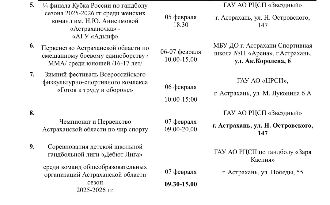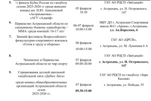 По данным пресс-службы Министерства физической культуры и спорта, на неделе со 2 по 8 февраля в Астраханской области пройдет 9 интересных мероприятий. Так, местных жителей и гостей региона ждут первенство России по гандболу, соревнования детской школьной гандбольной лиги, первенство ЮФО по прыжкам на батуте, зимний фестиваль ГТО и многое другое. Подробности ниже: