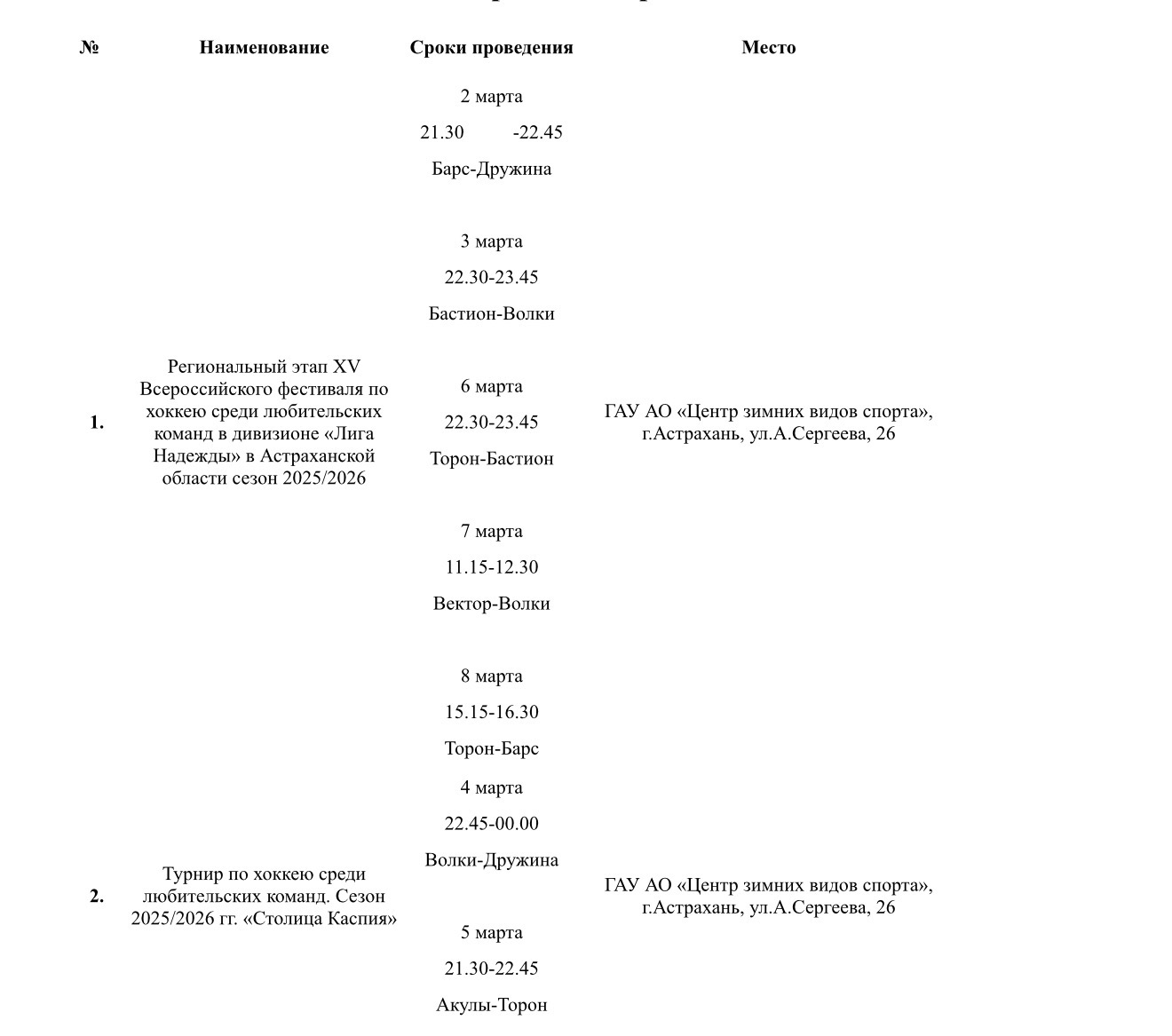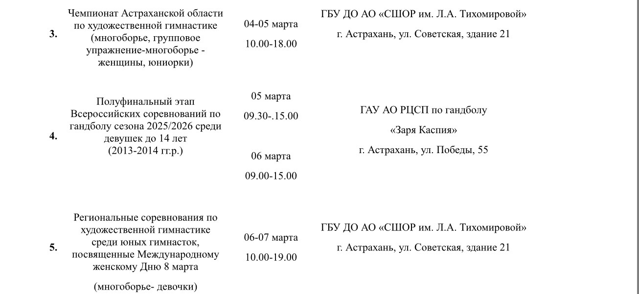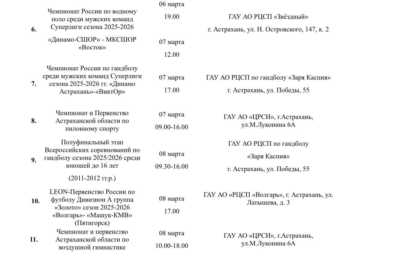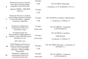 В пресс-службе Министерства физической культуры и спорта Астраханской области подготовили план-график мероприятий, которые пройдут на неделе со 2 по 8 марта. Так, в регионе состоятся турнир по хоккею, Всероссийские соревнования по гандболу, региональные соревнования по художественной гимнастике, чемпионат России по водному поло, чемпионат и первенство Астраханской области по воздушной гимнастике и многое другое. Подробности в галерее ниже: