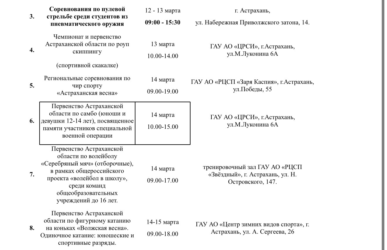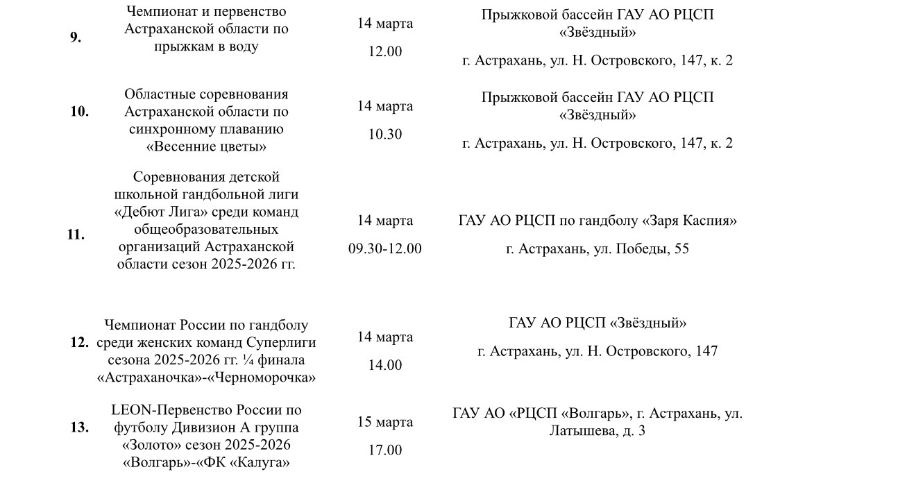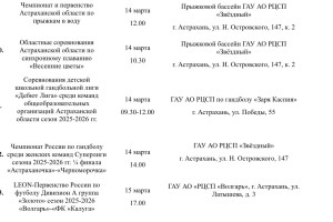 Министерство физической культуры и спорта подготовило план-график мероприятий, которые пройдут в Астраханской области с 9 по 15 марта. Так, местных жителей и гостей региона ждут Всероссийские соревнования по гандболу, фестиваль по хоккею, региональные соревнования по чир спорту, первенство области по фигурному катанию и многое другое. Подробности в галерее ниже: