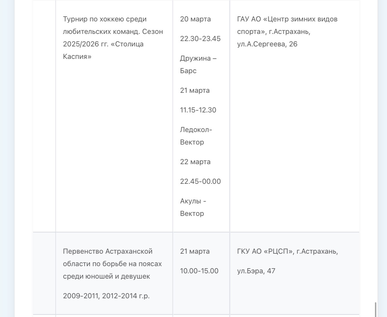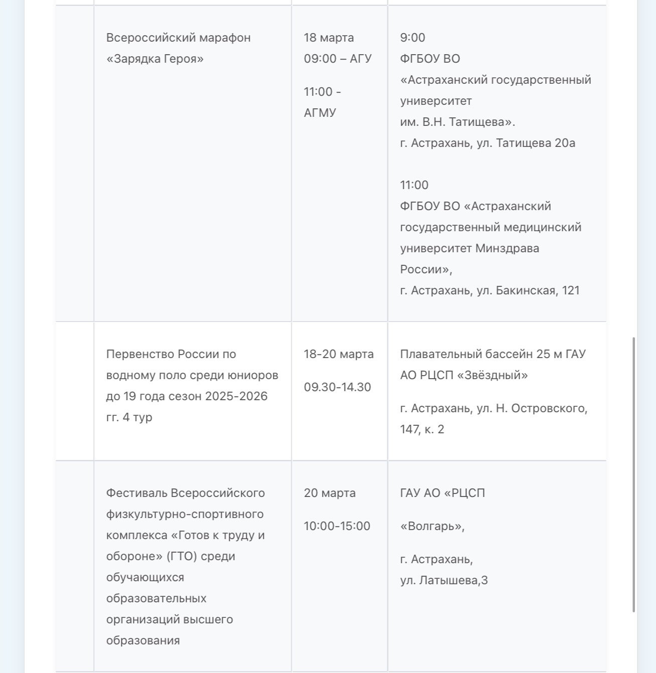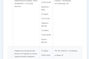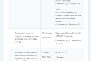 В Министерстве физической культуры и спорта Астраханской области опубликовали план-график состязаний, которые пройдут с 16 по 22 марта. В регионе пройдут Первенство России по гандболу, областной этап Всероссийского фестиваля по хоккею, Всероссийский марафон «Зарядка Героя», первенство России по водному поло, турнир по хоккею среди любительских команд. Подробности в галерее ниже: