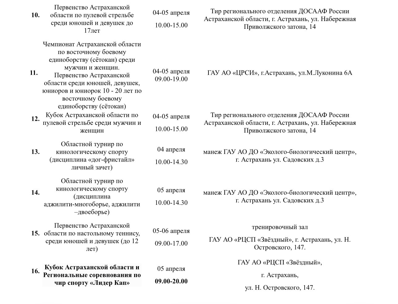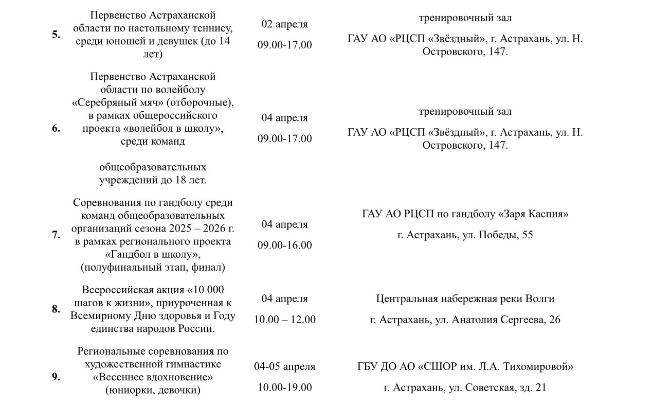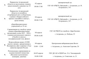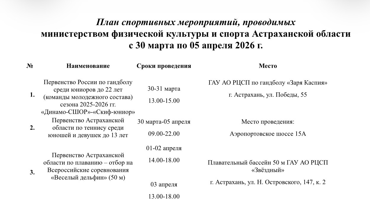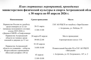 В Министерстве физической культуры и спорта Астраханской области подготовили план-график мероприятий, которые ждут местных жителей на неделе с 30 марта по 5 апреля. Так, в регионе пройдут первенство России по гандболу, первенство области по плаванию, турнир по хоккею, областной турнир по кинологическому спорту, чемпионат региона по восточному боевому единоборству и многое другое. Подробности в галерее ниже: